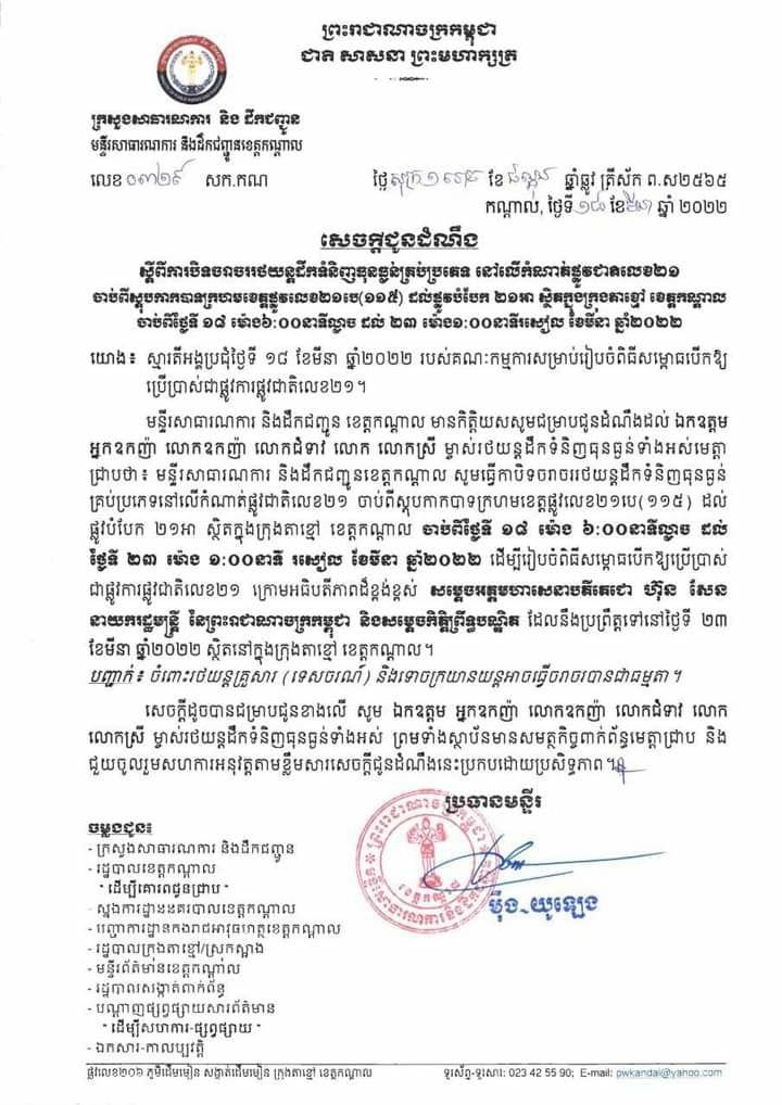 មន្ទីរសាធារណការខេត្តកណ្ដាល ជូនដំណឹងពីការបិទចរាចររថយន្តដឹកជញ្ជូនទំនិញធុនធ្ងន់គ្រប់ប្រភេទ នៅលើកំណាត់ផ្លូវជាតិលេខ២១ រយៈពេល ៥ថ្ងៃ ដើម្បីរៀបចំពិធីសម្ពោធបើកឲ្យប្រើប្រាស់ជាផ្លូវការ