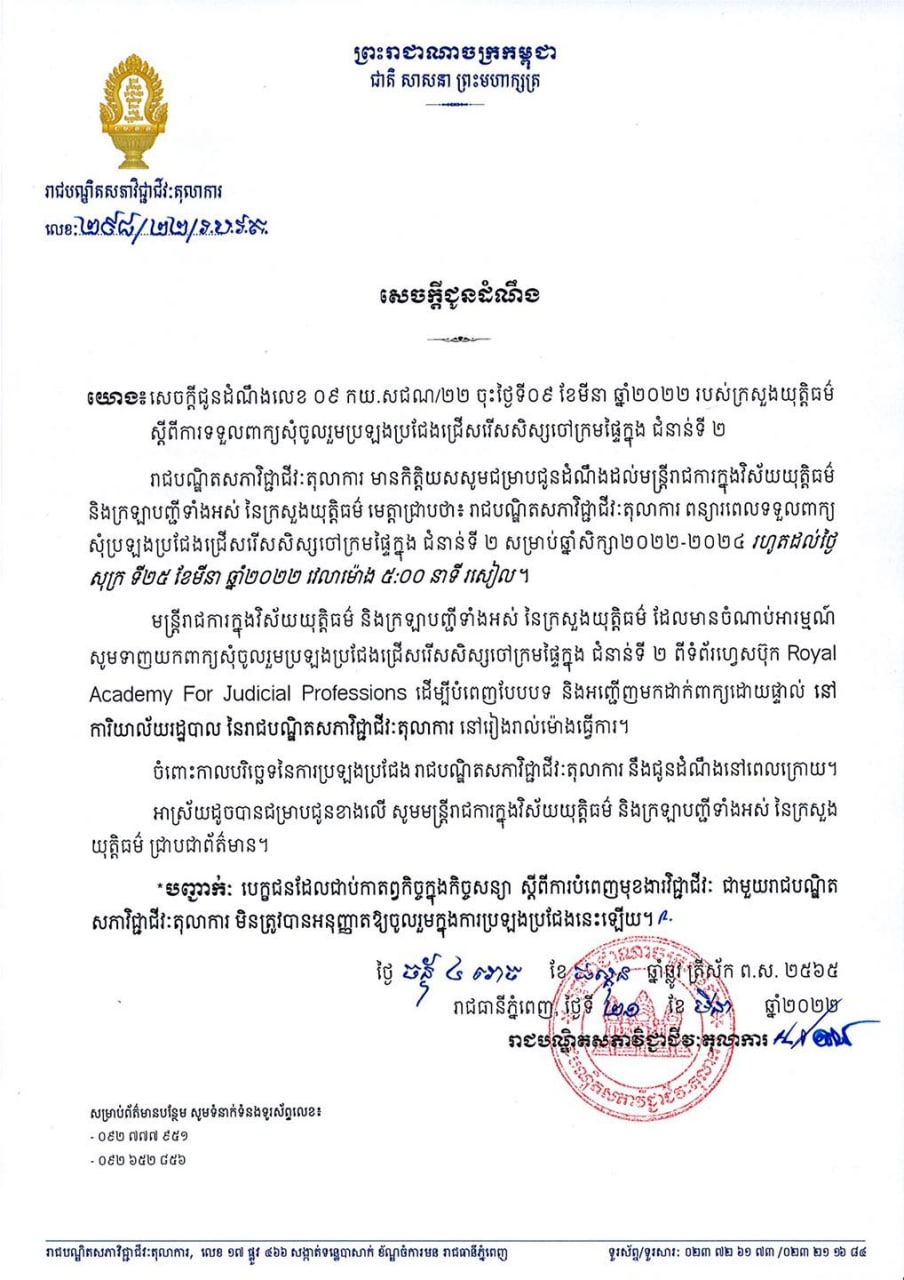 រាជធានីភ្នំពេញ៖ យោងតាមការចុះផ្សាយរបស់ រាជបណ្ឌិតសភាវិជ្ជាជីវៈតុលាការ នៅថ្ងៃទី២១ ខែមីនា ឆ្នាំ២០២២ បានចេញសេចក្ដីជូនដំណឹង ដល់មន្ត្រីរាជការក្នុងវិស័យយុត្តិធម៌និងក្រឡាបញ្ជីទាំងអស់ នៃក្រសួងយុត្តិធម៌ មេត្តាជ្រាបថា៖