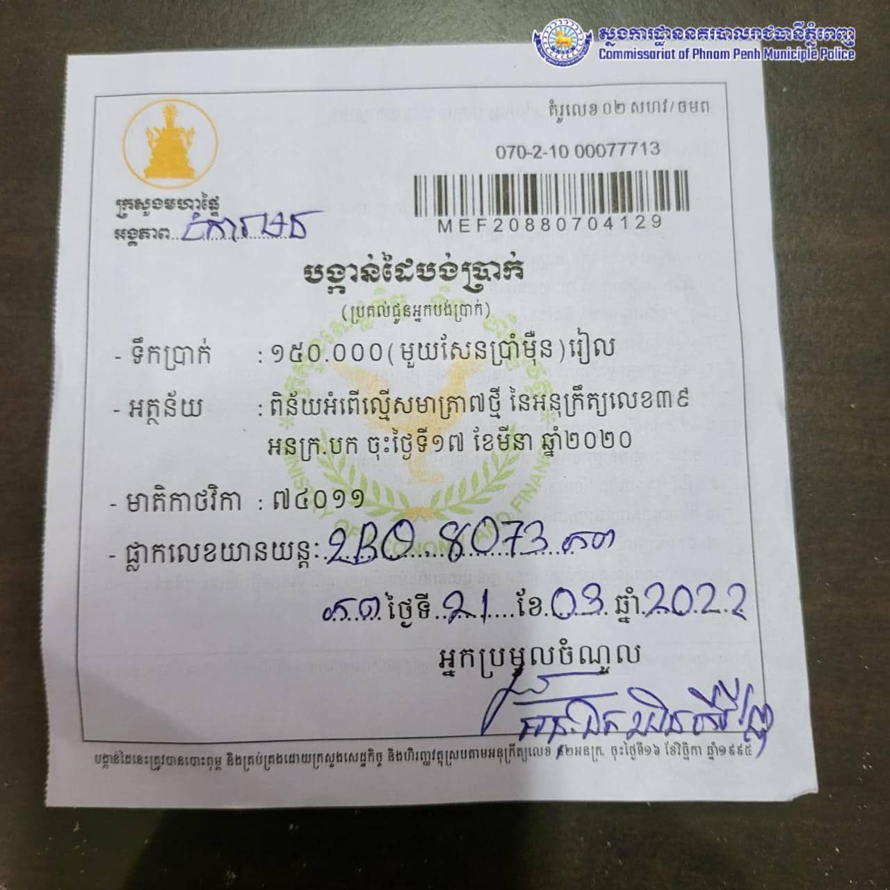 យោងតាមការបញ្ជាក់ពី ស្នងការដ្ឋាននគរបាលរាជធានីភ្នំពេញ បានឲ្យដឹងថា ម្ចាស់រថយន្ត Tundra ពាក់ផ្លាកលេខ ភ្នំពេញ 2BO-8073 ដែលបានបើកបរបញ្រ្ចាសទិសចរាចរណ៍ កាលពីយប់ថ្ងៃទី១៩ ខែមីនា ឆ្នាំ២០២២ ត្រូវបានសមត្ថកិច្ចនៃអធិការដ្ឋាននគរបាលខណ្ឌចំការមន កោះហៅឲ្យចូលខ្លួនដើម្បីធ្វើការផាកពិន័យតាមច្បាប់។