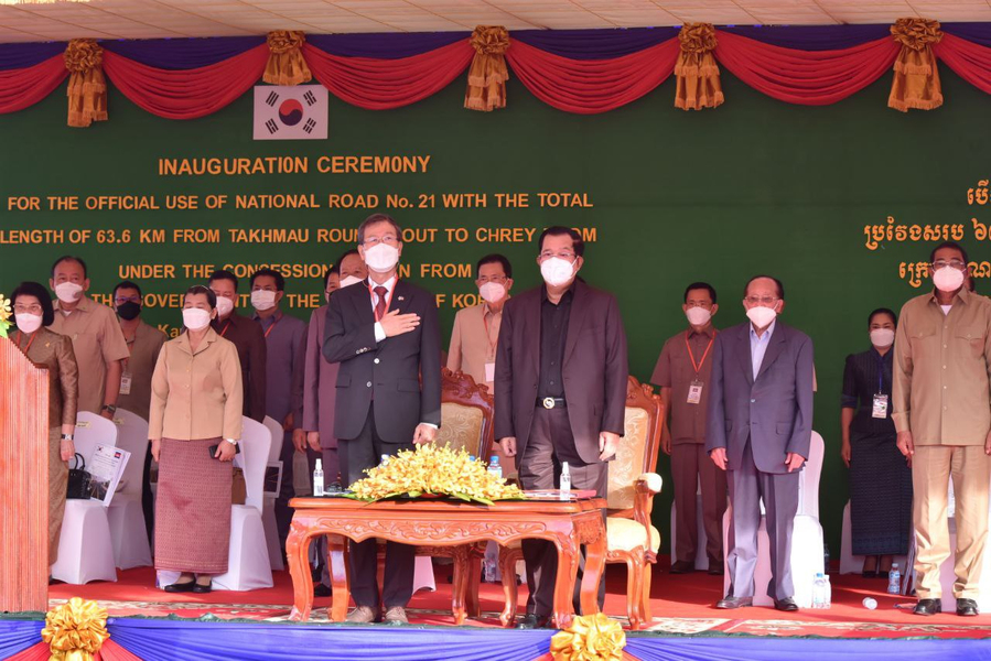 ក្នុងពិធីសម្ពោធបើកឱ្យប្រើប្រាស់ជាផ្លូវការផ្លូវជាតិលេខ២១ ដែលមានប្រវែងសរុប ៦៣,៦ គីឡូម៉ែត្រ ចាប់ពីរង្វង់មូលក្រុងតាខ្មៅ ទៅដល់ស្ពានជ្រៃធំ ស្រុកកោះធំ (ព្រំដែនកម្ពុជា-វៀតណាម) ដែលស្ថាបនាឡើងវិញក្រោមឥណទានសម្បទានពីរដ្ឋាភិបាលនៃសាធារណរដ្ឋកូរ៉ មានតម្លៃជាង ៦០លានដុល្លារសហរដ្ឋអាម៉េរិក នាព្រឹកថ្ងៃទី ២៣ ខែមីនា ឆ្នាំ២០២២ នៅខេត្តកណ្ដាល សម្ដេចតេជោ ហ៊ុន សែន បានថ្លែងថា «ជម្រើសនៃការសាងសង់ស្ពានមិត្តភាពកម្ពុជា-កូរ៉េ គឺមិត្តកូរ៉េបានយល់ព្រមជាមួយយើង ទៅលើការសិក្សា និងត្រៀមផ្ដល់ហិរញ្ញប្បទាន និងជំនួយឥតសំណងសម្រាប់ការសាងសង់ស្ពាន ហើយបានសិក្សានូវជម្រើសជាច្រើន។
