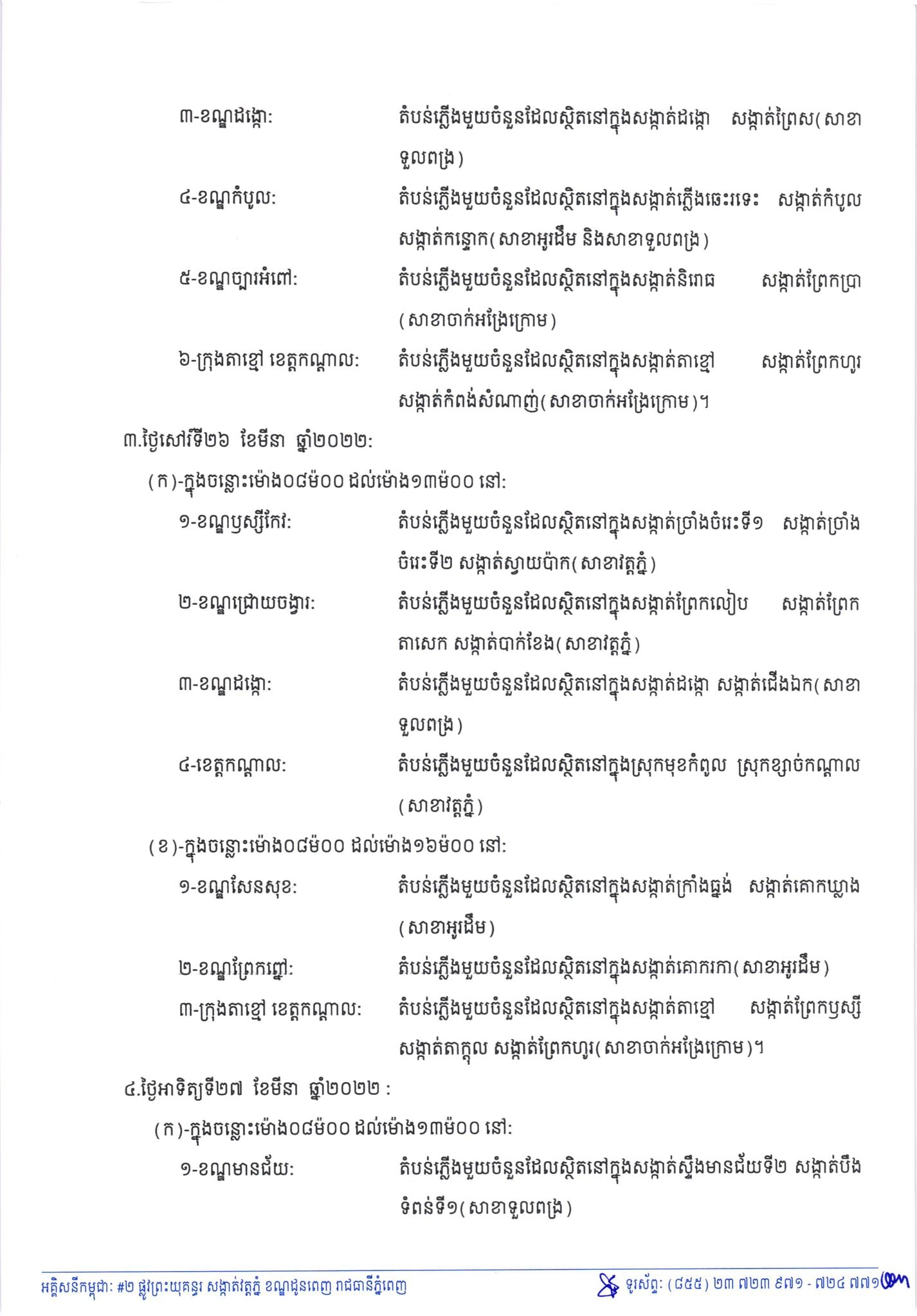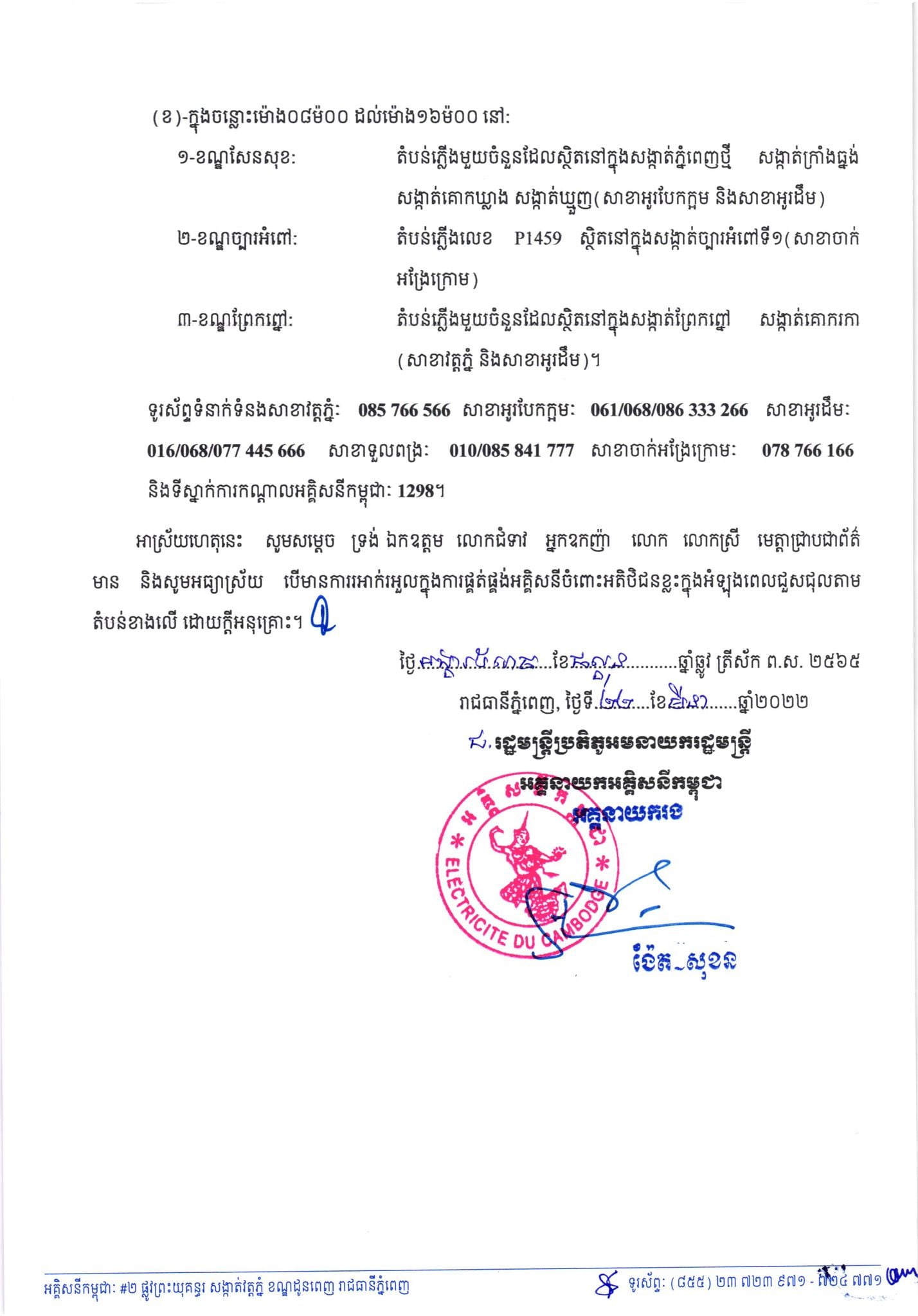 រាជធានីភំ្នពេញ៖ យោងតាមការចុះផ្សាយរបស់ អគ្គិសនីកម្ពុជា នៅថ្ងៃពុធ ០៦រោច ខែផល្គុន ឆ្នាំឆ្លូវ ត្រីស័ក ព.ស.២៥៦៥ ថ្ងៃទី២៣ ខែមីនា ឆ្នាំ២០២២ បានចេញសេចក្តីជូនដំណឹងស្តីពីការអនុវត្តការងារជួសជុល ផ្លាស់ប្តូរ តម្លើងបរិក្ខារនានា និងរុះរើគន្លងខ្សែបណ្តាញអគ្គិសនីរបស់អគ្គិសនីកម្ពុជា ដើម្បីបង្កលក្ខណៈងាយស្រួលដល់ការដ្ឋានពង្រីកផ្លូវ ចាប់ពីថ្ងៃនេះ ដល់ថ្ងៃទី២៧ ខែមីនា ឆ្នាំ២០២២ នៅតំបន់មួយចំនួនទៅតាមពេលវេលា និងទីកន្លែងដូចសេចក្តីជូនដំណឹងលម្អិតខាងក្រោម។