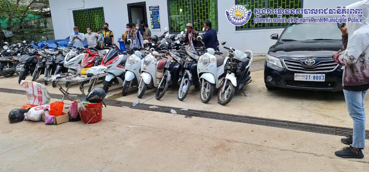 ករណីទី២៖ លួចយកម៉ូតូ ចំនួន០៩គ្រឿង ប្រព្រឹត្តនៅចំណុចវិទ្យាស្ថានជាតិពហុបច្ចេកទេសកម្ពុជា ភូមិព្រៃពពេល សង្កាត់សំរោងក្រោម ខណ្ឌពោធិ៍សែនជ័យ រាជធានីភ្នំពេញ កាលពីថ្ងៃទី១១ ខែមីនា ឆ្នាំ២០២២។ សម្ភារបាត់បង់៖ ម៉ាកហុងដាសេ១២៥ ពណ៌ ខ្មៅ ឆ្នាំផលិត២០១៨ ពាក់ផ្លាកលេខពោធិ៍សាត់ ១H៣៦៥៧, ម៉ូតូម៉ាកហុងដាសេ១២៥ ពណ៌ខ្មៅ ឆ្នាំផលិត២០១៧ ពាក់ផ្លាកលេខ កំពង់ធំ ១J៧៩៣០, ម៉ូតូហុងដាស១២៥ ពណ៌ខ្មៅ ឆ្នាំផលិត២០១៧ ពាក់ផ្លាកលេខ (បាត់)ដំបង១AA៦៥៨៩, ម៉ូតូម៉ាកហុងដាសេ១២៥ ពណ៌ខ្មៅ ឆ្នាំផលិត២០១៤ ពាក់ផ្លាកលេខ ស្វាយរៀង១D៧២៩៨, ម៉ូតូម៉ាកហុងដា សេ១២៥ ពណ៌ខ្មៅ ឆ្នាំផលិត២០១៥ ពាក់ផ្លាកលេខ កំពង់ស្ពឺ១G១៤២៩, ម៉ូតូម៉ាកហុងដា សេ១២៥ ពណ៌ខ្មៅ ឆ្នាំផលិត២០២០ គ្មានផ្លាកលេខ, ម៉ូតូម៉ាកហុងដា សេ១២៥ ពណ៌ខ្មៅ ឆ្នាំផលិត២០១៨ ពាក់ផ្លាកលេខ តាកែវ១Q៣៦៨៧, ម៉ូតូម៉ាកហុងដា សេ១២៥ ពណ៌ខ្មៅ ឆ្នាំផលិត២០២០ ពាក់ផ្លាកលេខ តាកែវ១V៩៧០៦, ម៉ូតូម៉ាកហុងដាសេ១២៥ ពណ៌ខ្មៅ ឆ្នាំផលិត២០២០ ពាក់ផ្លាកលេខត្បូងឃ្មុំ ១H៨៩១៦។
