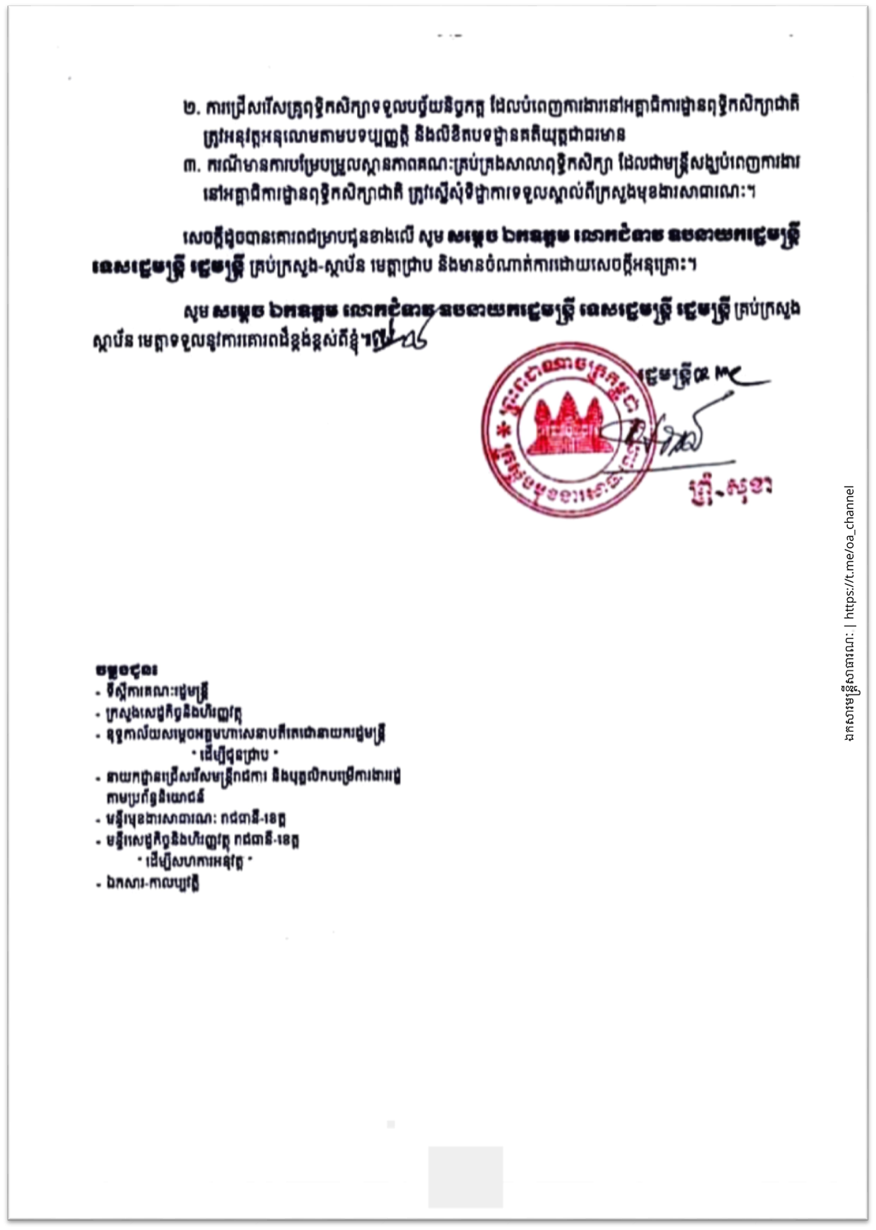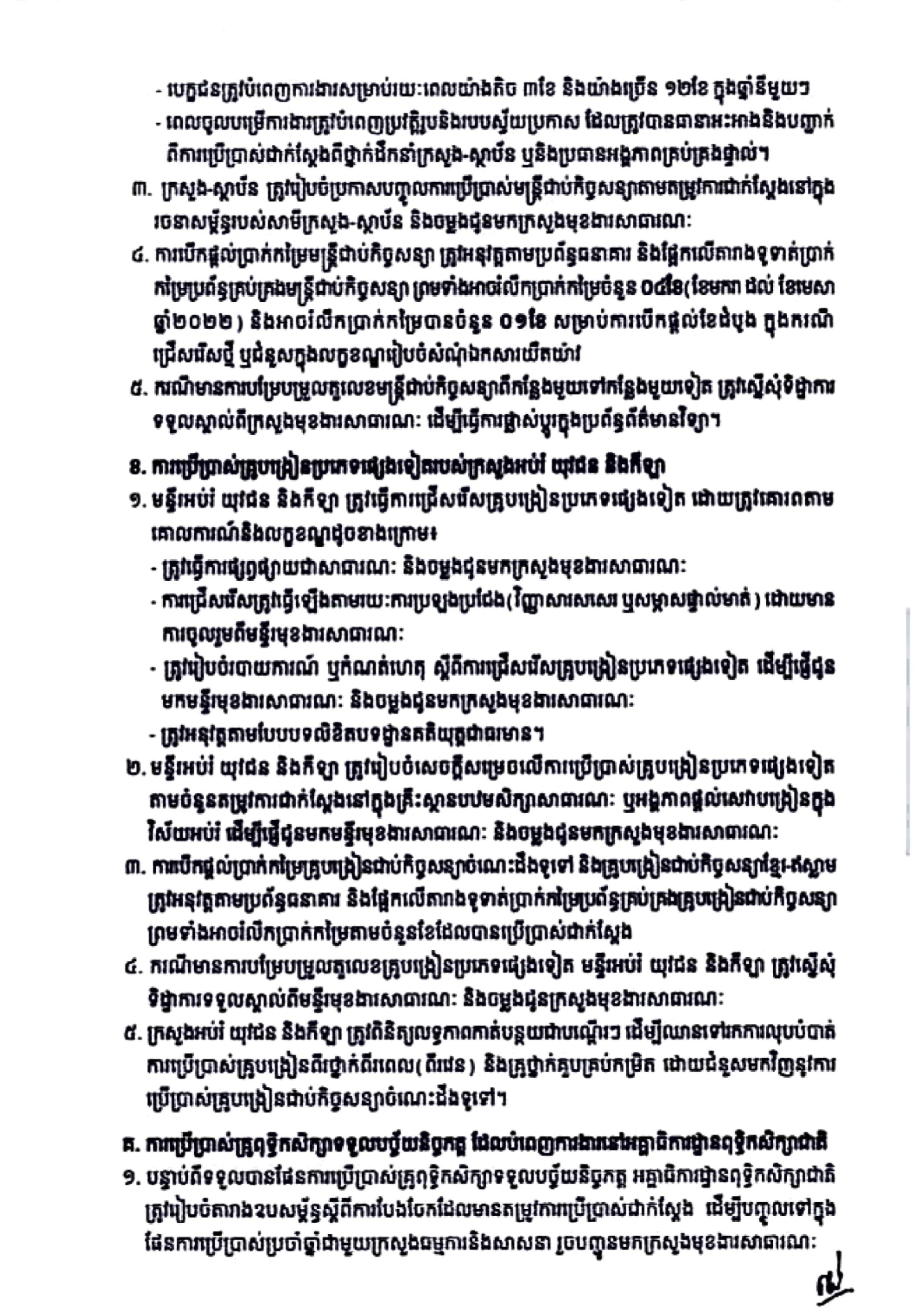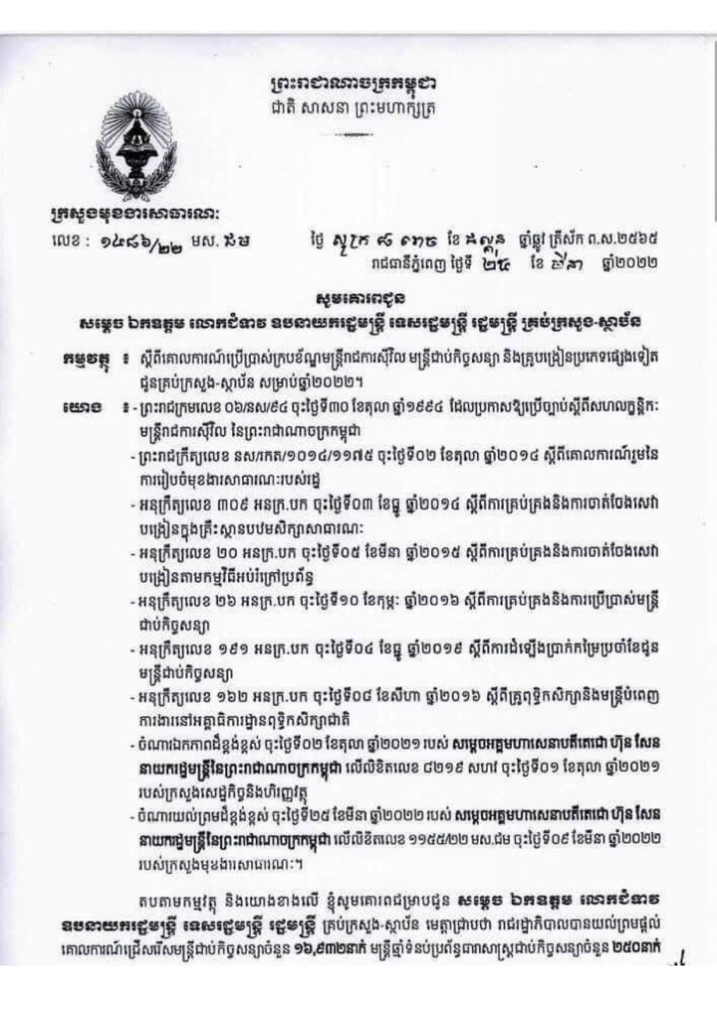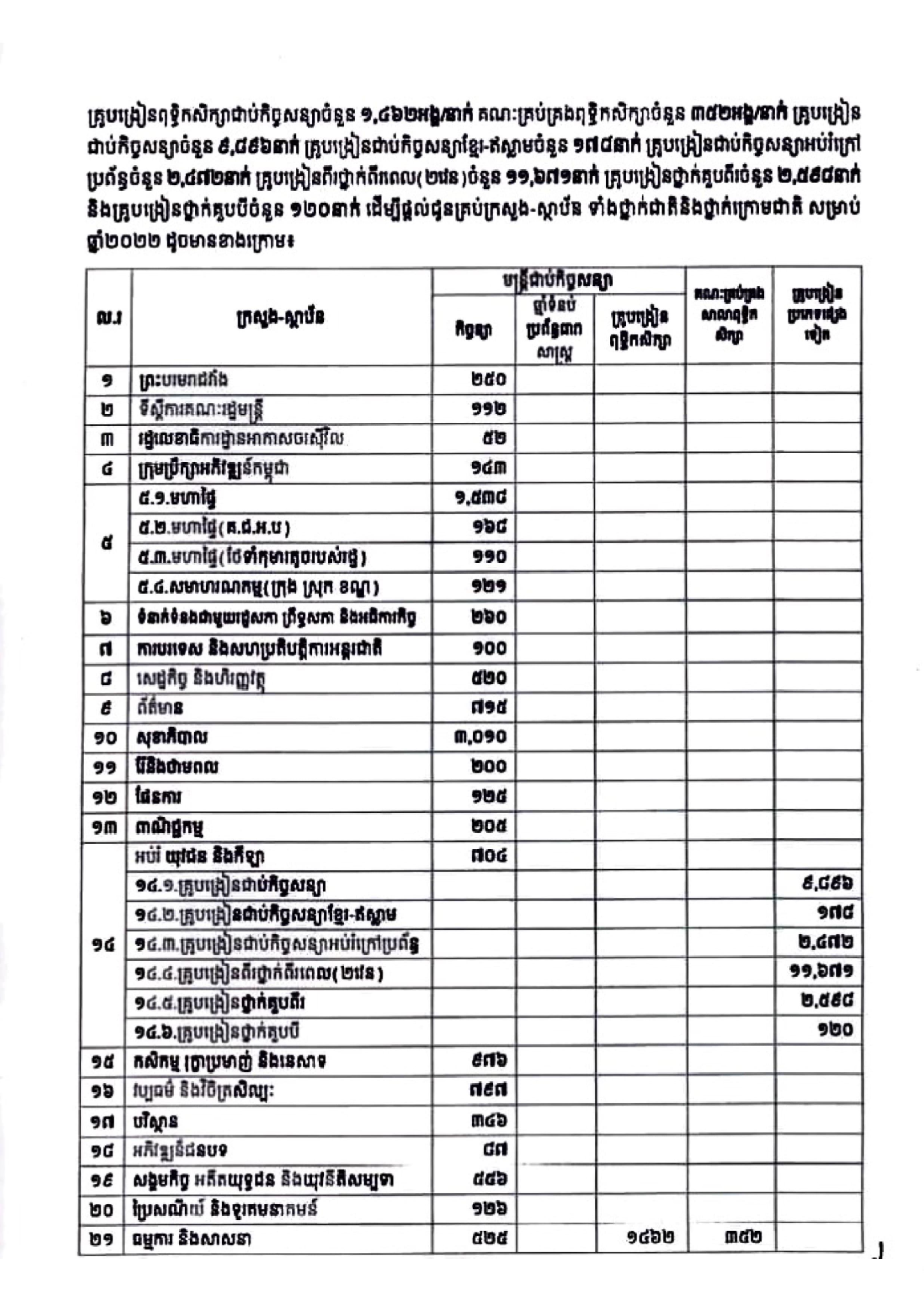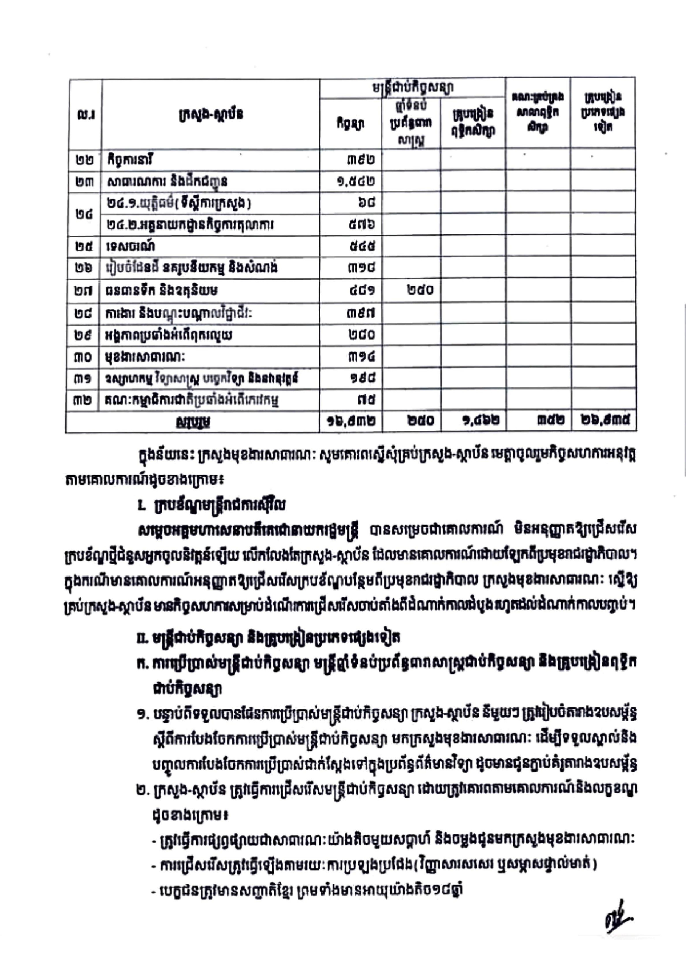 ក្រសួងមុខងារសាធារណៈ សូមជម្រាបជូនថា រាជរដ្ឋាភិបាលបានយល់ព្រមផ្ដល់គោលការណ៍ជ្រើសរើសមន្ត្រីជាប់កិច្ចសន្យាចំនួន ១៦,៩៣២នាក់ មន្ត្រីឆ្មាំទំបន់ប្រព័ន្ធធារាសាស្ត្រជាប់កិច្ចសន្យាចំនួន ២៥០នាក់ គ្រូបង្រៀនពុទ្ធិកសិក្សាជាប់កិច្ចសន្យាចំនួន ១,៤៦២អង្គ/នាក់ គណៈគ្រប់គ្រងពុទ្ធិកសិក្សាចំនួន ៣៥២អង្គ/នាក់ គ្រូបង្រៀនជាប់កិច្ចសន្យាចំនួន ៩,៨៩៦នាក់ គ្រូបង្រៀនជាប់កិច្ចសន្យាខ្មែរ-ឥស្លាមចំនួន ១៧៨នាក់ គ្រូបង្រៀនជាប់កិច្ចសន្យាអប់រំក្រៅប្រព័ន្ធចំនួន ២,៤៧២នាក់ គ្រូបង្រៀនពីរថ្នាក់ ពីរពេល(២វេន) ចំនួន ១១,៦៧១នាក់ គ្រូបង្រៀនថ្នាក់គួបពីរចំនួន ២,៥៩៨នាក់ និងគ្រូបង្រៀនថ្នាក់គួបបីចំនួន ១២០នាក់ ដើម្បីផ្ដល់ជូនគ្រប់ក្រសួង-ស្ថាប័ន ទាំងថ្នាក់ជាតិនិងថ្នាក់ក្រោមជាតិ សម្រាប់ឆ្នាំ២០២២ ដូចមានខាងក្រោម៖