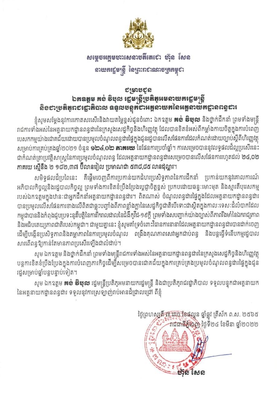 រាជធានីភ្នំពេញ៖ យោងតាមរយៈសារលិខិតរបស់ សម្តេចតេជោ ហ៊ុន សែន នាយករដ្ឋមន្ត្រី បានកោតសរសើរដល់ថ្នាក់ដឹកនាំ និងមន្ត្រី នៃអគ្គនាយកដ្ឋានពន្ធដារ ដែលបានប្រឹងប្រែងបំពេញការងាររបស់ខ្លួនយ៉ាងសកម្មដោយជោគជ័យលើការប្រមូលចំណូលពន្ធផ្ទៃក្នុងជូនរដ្ឋលើសផែនការកំណត់ដោយច្បាប់ស្តីពីហិរញ្ញវត្ថុសម្រាប់ការគ្រប់គ្រងឆ្នាំ២០២១ ចំនួន១២៤.០២ភាគរយ នៃផែនការប្រចាំឆ្នាំ។ ការសម្រេចបាននូវលទ្ធផលដ៏ល្អប្រសើរនេះ ជាកំណត់ត្រាប្រវត្តិសាស្រ្តនៃការប្រមូលចំណូលពន្ធ ដែលអគ្គនាយកដ្ឋានពន្ធដារ សម្រេចបានលើសផែនការរហូតដល់ ២៤.០២ភាគរយ ស្មើនឹង ២ ១៨២.៣៧ ប៊ីលានរៀល ប្រមាណជា ៥៣៨.៨៥ លានដុល្លារ។