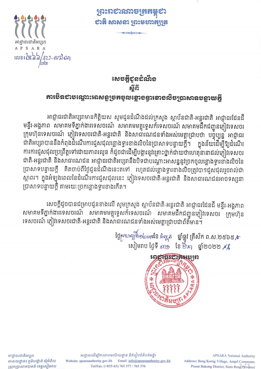 អាជ្ញាធរជាតិអប្សរាមានកិត្តិយស សូមជូនដំណឹងដល់ក្រសួង ស្ថាប័នជាតិ-អន្តរជាតិ អាជ្ញាធរដែនដីមន្ទីរ-អង្គភាព សមាគមទីភ្នាក់ងារទេសចរណ៍ សមាគមមគ្គុទ្ទេសក៍ទេសចរណ៍ សមាគមដឹកជញ្ជូនភ្ញៀវទេសចរ ក្រុមហ៊ុនទេសចរណ៍ ភ្ញៀវទេសចរជាតិ-អន្តរជាតិ និងសាធារណជនទាំងអស់មេត្តាជ្រាបថា៖