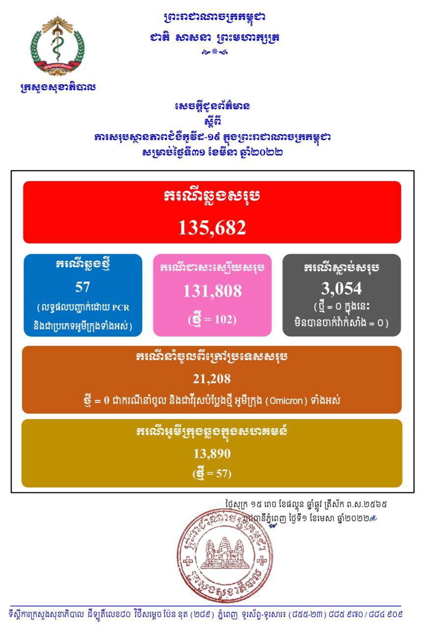 នៅថ្ងៃទី01 ខែមេសា ឆ្នាំ2022នេះ ក្រសួងសុខាភិបាលកម្ពុជា បានចេញសេចក្តីជូនដំណឹងពី ការរកឃើញករណីវិជ្ជមានវីរុសកូវីដ១៩ថ្មី ចំនួន 57នាក់ (លទ្ធផលបញ្ជាក់ដោយ PCR នឹងជាប្រភេទអូមីក្រុងទាំងអស់) ក្នុងនោះករណីឆ្លងសហគមន៍ 57នាក់ និងមិនមានករណីនាំចូលនោះទេ ខណៈអ្នកបានជាសះស្បើយថ្មីមានចំនួន 102នាក់ និងមិនមានអ្នកបាត់បង់ជីវិតទេ ហើយគិតមកទល់ពេលនេះ ករណីឆ្លងកូវីដ១៩ សរុបនៅក្នុងប្រទេសកម្ពុជា មានចំនួន 135,682 នាក់, ករណីជាសះស្បើយសរុប 131,808 នាក់ និងស្លាប់សរុប 3,054 នាក់៕