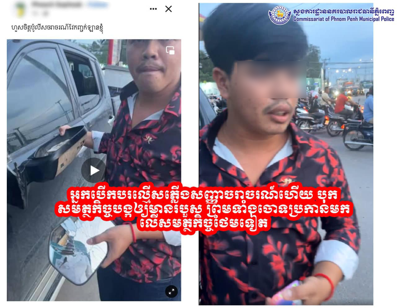 សមត្ថកិច្ចកំពុងស្រាវជ្រាវរកបុគ្គលម្នាក់នេះ ដែលបើកឡានល្មើសច្បាប់ ហើយបើកបុកមន្ត្រីអនុវត្តច្បាប់ឱ្យរបួសដៃ រួចរត់គេច និងបង្ហោះពាក្យសំដីបែបនេះលើហ្វេសប៊ុកទៀត