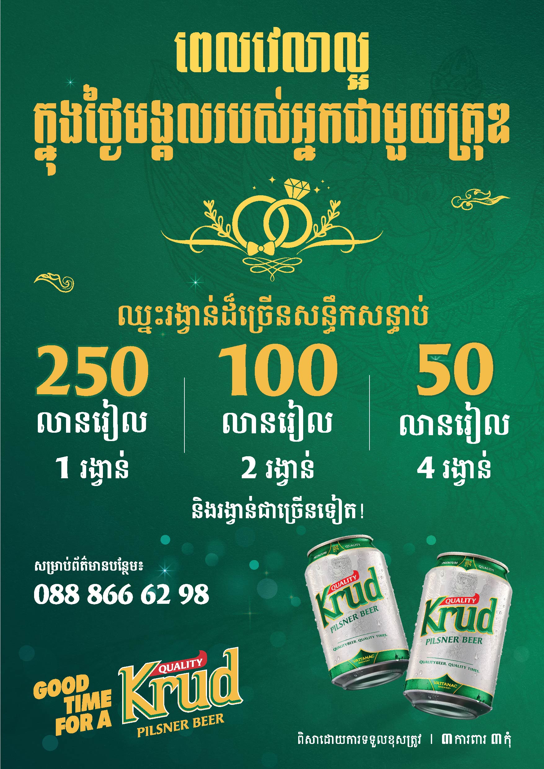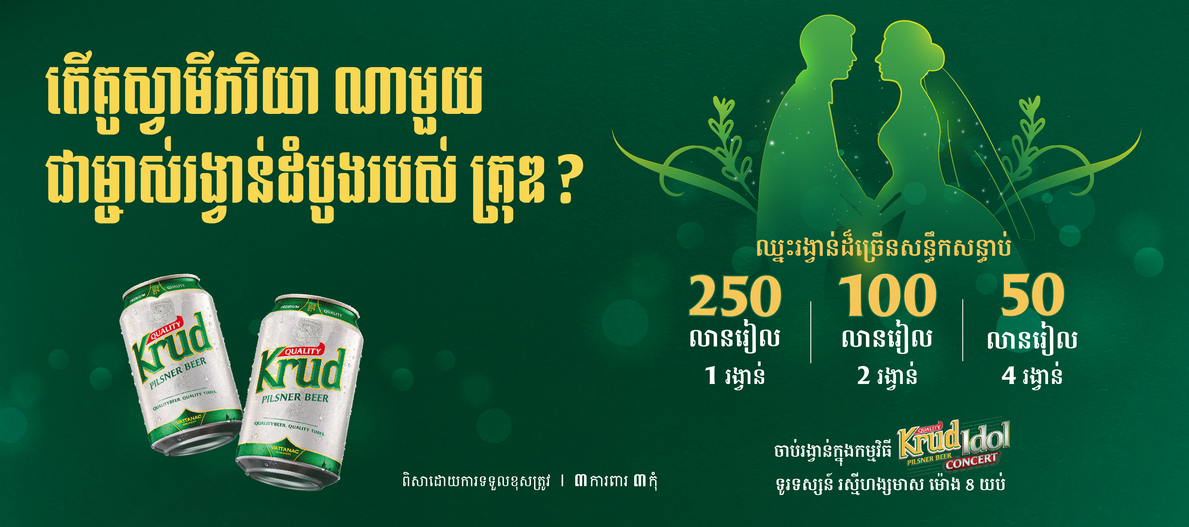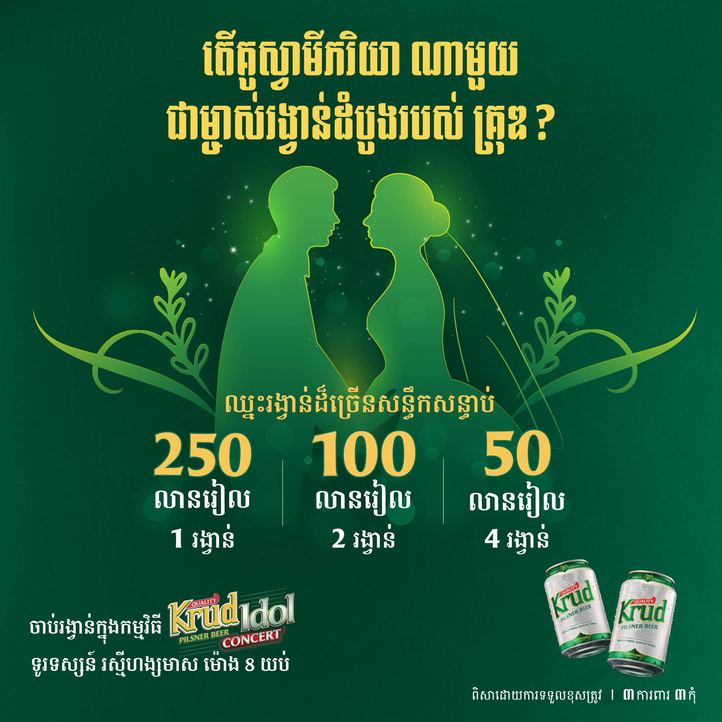 ស្រាបៀរគ្រុឌ នឹងផ្តល់ពេលវេលាល្អ ស្វែងរកគូស្វាមីភរិយាដំបូងបង្អស់ ដែលមានឱកាសឈ្នះ ប្រាក់សុទ្ធ “៥០លានរៀល”។ តើលោកអ្នក ក៏ដូចជាអតិថិជនស្រាបៀរគ្រុឌទាំងអស់ចង់ដឹងទេថា គូស្វាមីភរិយាមួយណា ដែលមានសំណាង ឈ្នះរង្វាន់លើកដំបូងពី យុទ្ធនាការ ”ពេលវេលាល្អក្នុងថ្ងៃមង្គលរបស់អ្នក ជាមួយស្រាបៀរគ្រុឌ”? សូមចូលរួមតាមដានទាំងអស់គ្នាសប្តាហ៍នេះ ក្នុងកម្មវិធី Krud Idol Concert នាថ្ងៃសៅរ៍ ទី២ ខែមេសា ឆ្នាំ២០២២ ចាប់ពីម៉ោង ៨យប់តទៅ ដែលមានការផ្សាយផ្ទាល់ លើកញ្ចក់ទូរទស្សរស្មីហង្សមាស និងផេកផ្លូវការ របស់ស្រាបៀរគ្រុឌ។