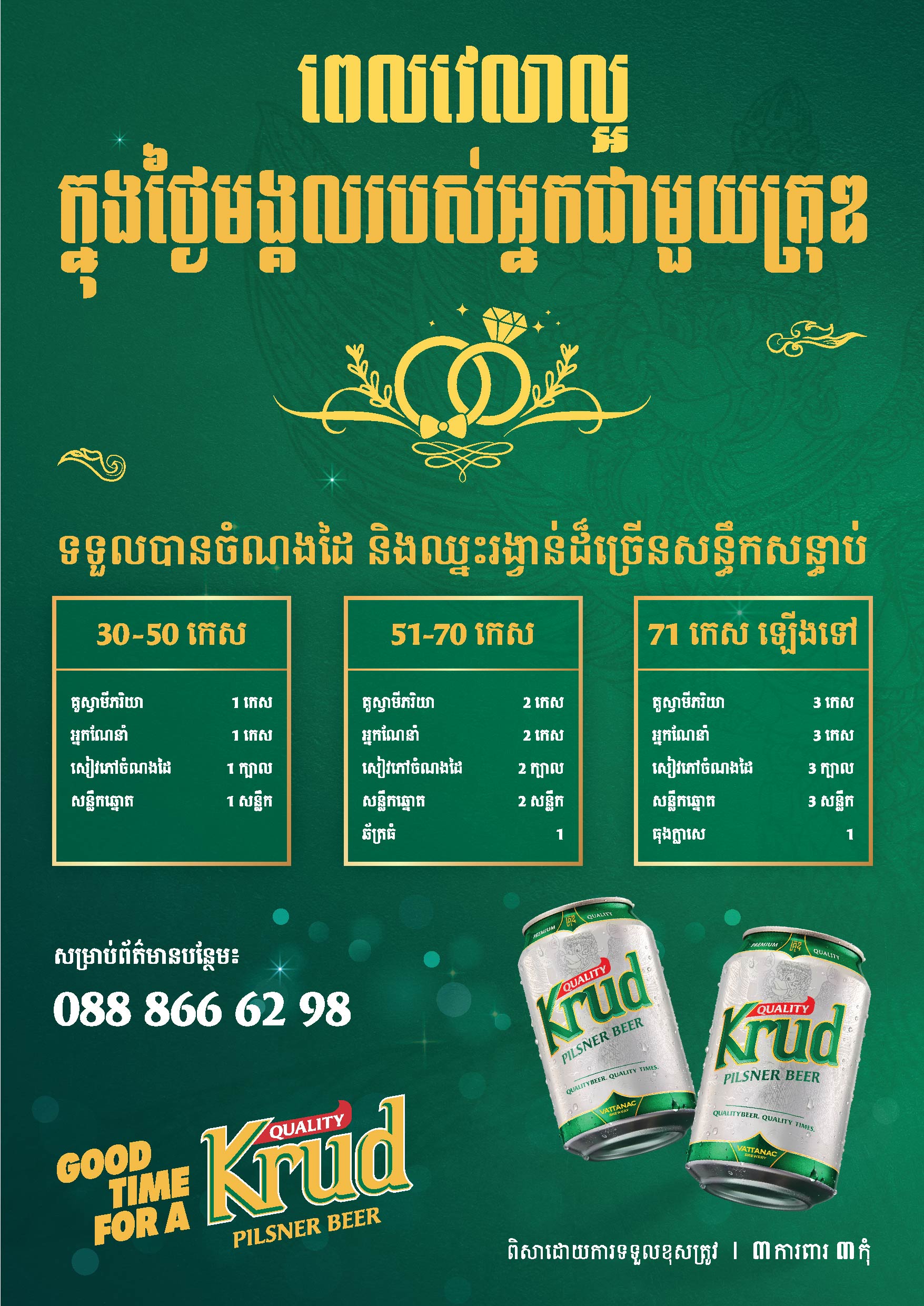 ដោយសារតែស្រាបៀរគ្រុឌ តែងតែចែករំលែកពេលវេលាល្អ ដូច្នេះហើយគ្រប់គូស្វាមីភរិយាដែលជ្រើសរើស ស្រាបៀរគ្រុឌ ក្នុងថ្ងៃអាពាហ៍ពិពាហ៍ នឹងទទួលបានចំណងដៃភ្លាមៗដូចជា៖ សៀវភៅកត់ចំណងដៃ ធុងក្លាសេ និងឆ្នោតផ្សងសំណាង ដែលមានឱកាស ឈ្នះប្រាក់សុទ្ធចាប់ពី ៥០លានរៀល រហូតដល់ ២៥០លានរៀល ព្រមទាំងរង្វាន់ជាច្រើនទៀត។ ចែករំលែកពេលវេលាល្អ ជាមួយស្រាបៀរគ្រុឌ ។ ស្រាបៀរគ្រុឌ ពេលវេលាល្អ ពេលវេលាជាមួយគ្រុឌ៕