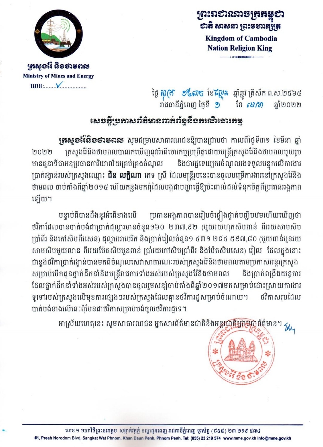 ក្រសួងរ៉ែនិងថាមពល សូមជម្រាបសាធារណជនឲ្យបានជ្រាបថា កាលពីថ្ងៃទី៣១ ខែមីនា ឆ្នាំ២០២២ ក្រសួងរ៉ែ និងថាមពល បានរកឃើញនូវអំពីចោរកម្មប្រព្រឹត្តិដោយមន្ត្រីក្រសួងរ៉ែ និងថាមពលមួយរូបមានតួនាទី ជាអនុប្រធានការិយាល័យគ្រប់គ្រងចំណូល និងជារជ្ជទេយ្យករចំណូលរងទទួលបន្ទុកលើការងារប្រាក់រង្វាន់របស់ក្រសួងឈ្មោះ ជិន លក្ខិណា ភេទស្រី ដែលមន្ត្រីរូបនេះបានចូលបម្រើការងារនៅក្រសួងរ៉ែនិងថាមពល ចាប់ពីឆ្នាំ២០១៥ ហើយកន្លងមកពុំដែលបង្កបញ្ហាធ្វើឲ្យប៉ះពាល់ដល់ទំនុកចិត្តពីប្រធានអង្គភាពឡើយ។