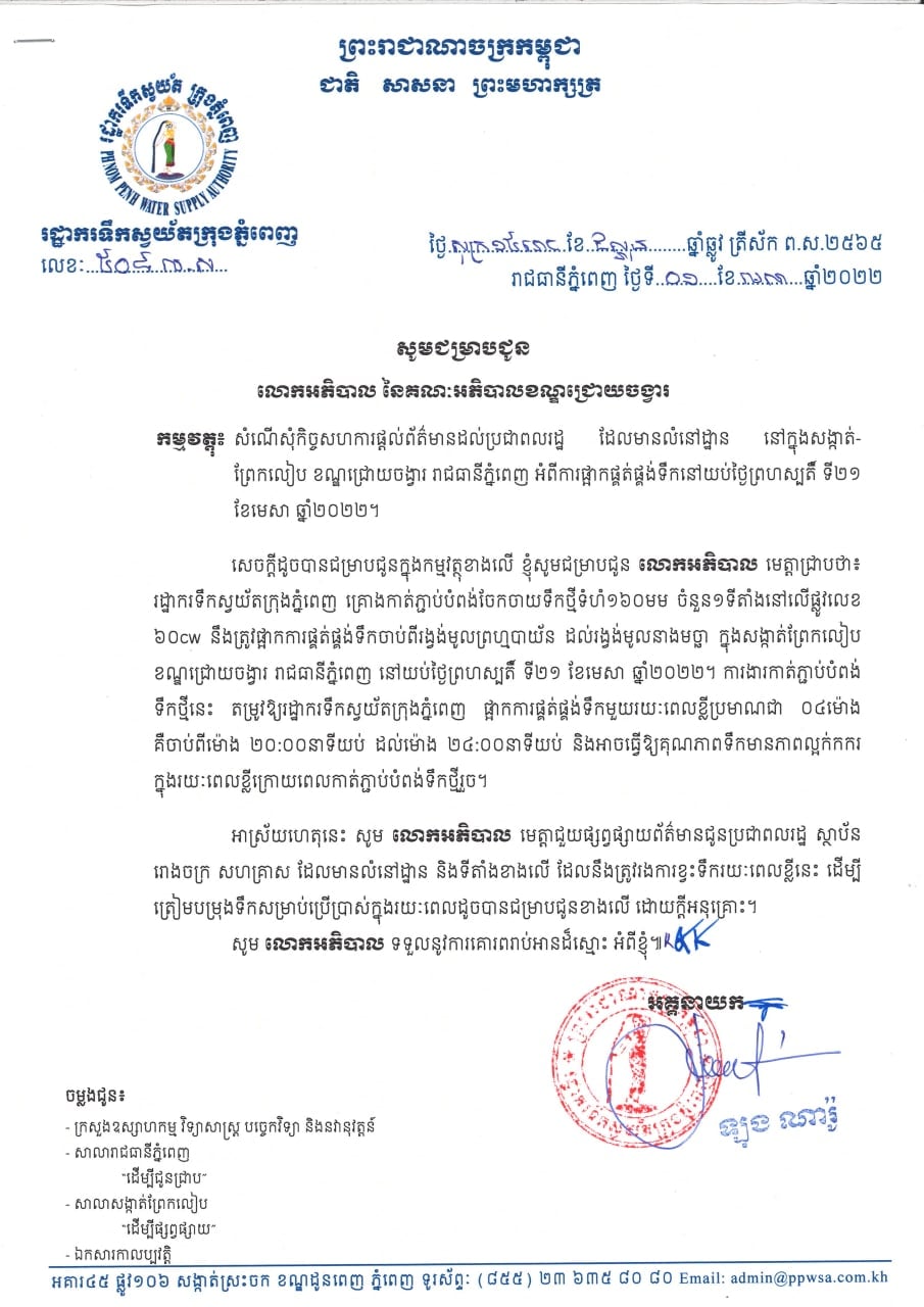 រាជធានីភ្នំពេញ៖ យោងតាមការចុះផ្សាយរបស់ រដ្ឋាករទឹកស្វយ័តក្រុងភ្នំពេញ នៅថ្ងៃទី០៤ ខែមេសា ឆ្នាំ២០២២ បានចេញសេចក្ដីជូនដំណឹងស្ដីពីការផ្អាកការផ្គត់ផ្គង់ទឹករយៈពេលខ្លីចំនួន០២ទីតាំងដូចខាងក្រោម៖