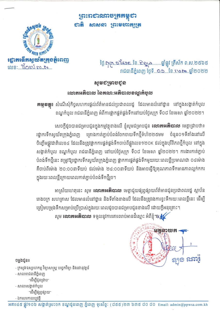 រដ្ឋាករទឹកស្វយ័តក្រុងភ្នំពេញ នឹងផ្អាកការផ្គត់ផ្គង់ទឹករយៈពេលខ្លីចំនួន ២ទីតាំង ទៅតាមពេលវេលាទាំងនេះ