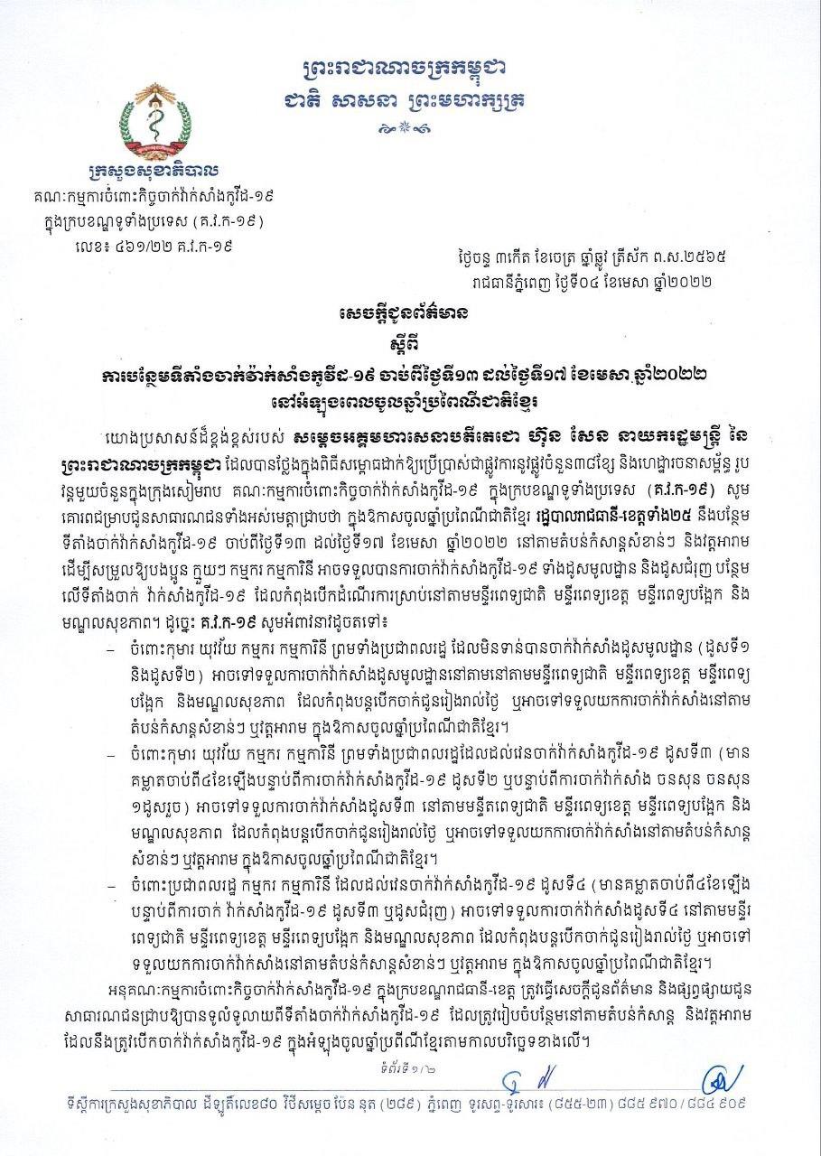 ក្រសួងសុខាភិបាល ជូនព័ត៌មានពីការបន្ថែមទីតាំងចាក់វ៉ាក់សាំងកូវីដ-១៩ ចាប់ពីថ្ងៃទី១៣ ដល់ថ្ងៃទី១៧ ខែមេសា ឆ្នាំ២០២២ នៅអំឡុងពេលចូលឆ្នាំប្រពៃណីជាតិខ្មែរ