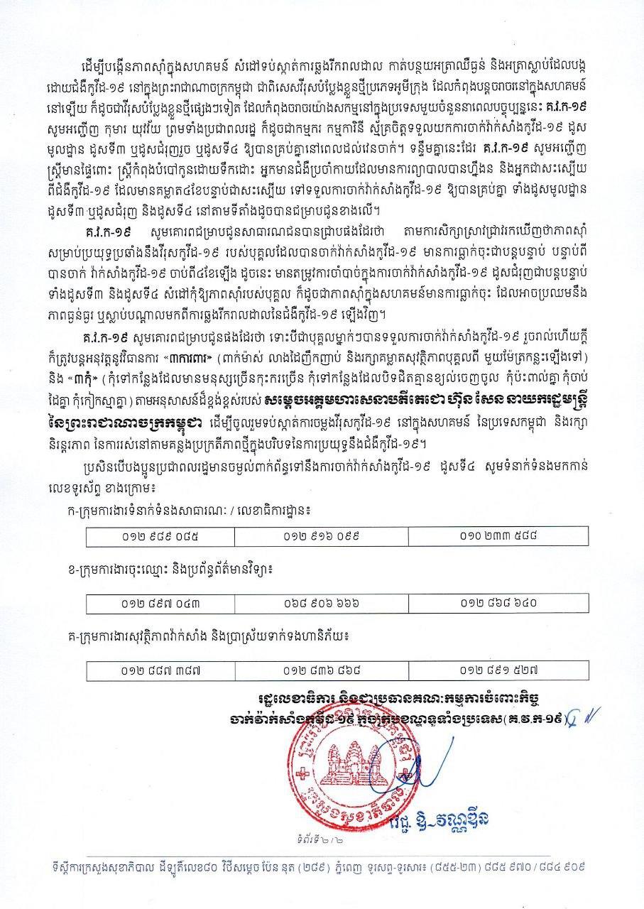 ដោយយោង​ប្រសាសន៍ដ៏ខ្ពង់ខ្ពស់របស់ សម្តេចអគ្គមហានាបតីតេជោ ហ៊ុន សែន នាយរដ្ឋមន្ត្រីនៃកម្ពុជា បានថ្លែងក្នុងពិធីសម្ពាធដាក់ឲ្យប្រើប្រាស់ជាផ្លូវការនូវផ្លូវចំនួន ៣៨ខ្សែ និងហេដ្ឋរចនាសម្ព័ន្ធរូបវន្តមួយចំនួនក្នុងសៀមរាប គណៈកម្មការចំពោះកិច្ចចាក់វ៉ាក់សាំងកូវីដ-១៩ ក្នុងក្របខណ្ឌទូទាំងប្រទេស សូមគោរពជម្រាបជូនសាធារណនទាំងអស់មេត្តាជ្រាបថា៖ ក្នុងឱកាសចូលឆ្នាំប្រពៃណីជាតិខ្មែរ រដ្ឋបាលរាជធានី-ខេត្តទាំង២៥ នឹងបន្ថែមទីចាក់វ៉ាក់សាំងកូវីដ-១៩ ចាប់ពីថ្ងៃ១៣ ដល់ថ្ងៃទី១៧ ខែមេសា ឆ្នាំ២០២២ នៅតាមតំបន់កំសាន្តសំខាន់ៗ និងវត្តអារាមដើម្បីសម្រួលឲ្យបងប្អូនប្រពលរដ្ឋ ក្មួយៗ កម្មករ កម្មការិនី អាចទទួលបានចាក់វ៉ាក់សាំងកូវីដ-១៩ ទាំងដូសមូលដ្ឋាន និងដូសជំរុញ បន្ថែមលើទីតាំងចាក់ វ៉ាក់សាំងកូវីដ-១៩ ដែលកំពុងបើកដំណើរការស្រាប់នៅតាមមន្ទីរពេទ្យជាតិ មន្ទីរពេទ្យខេត្ត មន្ទីរពេទ្យបង្អែក និងមណ្ឌលសុខភាព៕ ដូច្នេះ គ.វ.ក-១៩ សូមអំពាវនាវដូចតទៅ៖