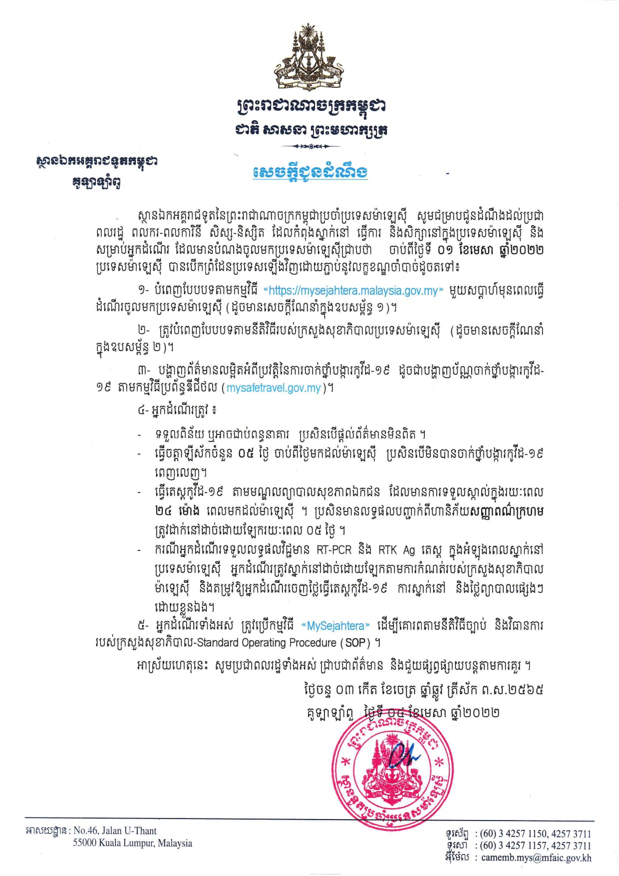 រាជធានីភ្នំពេញ៖ យោងតាមការចុះផ្សាយរបស់ ស្ថានឯកអគ្គរាជទូតកម្ពុជា នៅថ្ងៃទី០៥ ខែមេសាឆ្នាំ២០២២ បានចេញសេចក្ដីជូនដំណឹង សូមជម្រាបដល់ប្រជាពលរដ្ឋ ពលរដ្ឋ ពលករ-ពលការិនី សិស្ស-និស្សិត ដែលកំពុងស្នាក់នៅ ធ្វើការ និងសិក្សានៅក្នុងប្រទេសម៉ាឡេស៊ី និងសម្រាប់អ្នកដំណើរ ដែលមានបំណងចូលមកប្រទេសម៉ាឡេស៊ីឲ្យបានជ្រាបថា ចាប់ពីថ្ងៃទី០១ ខែមេសា ឆ្នាំ២០២២ ប្រទេសម៉ាឡេស៊ី បានបើកព្រំដែនប្រទេសឡើងវិញដោយភ្ជាប់នូវលក្ខខណ្ឌចាំបាច់ដូចតទៅ៖