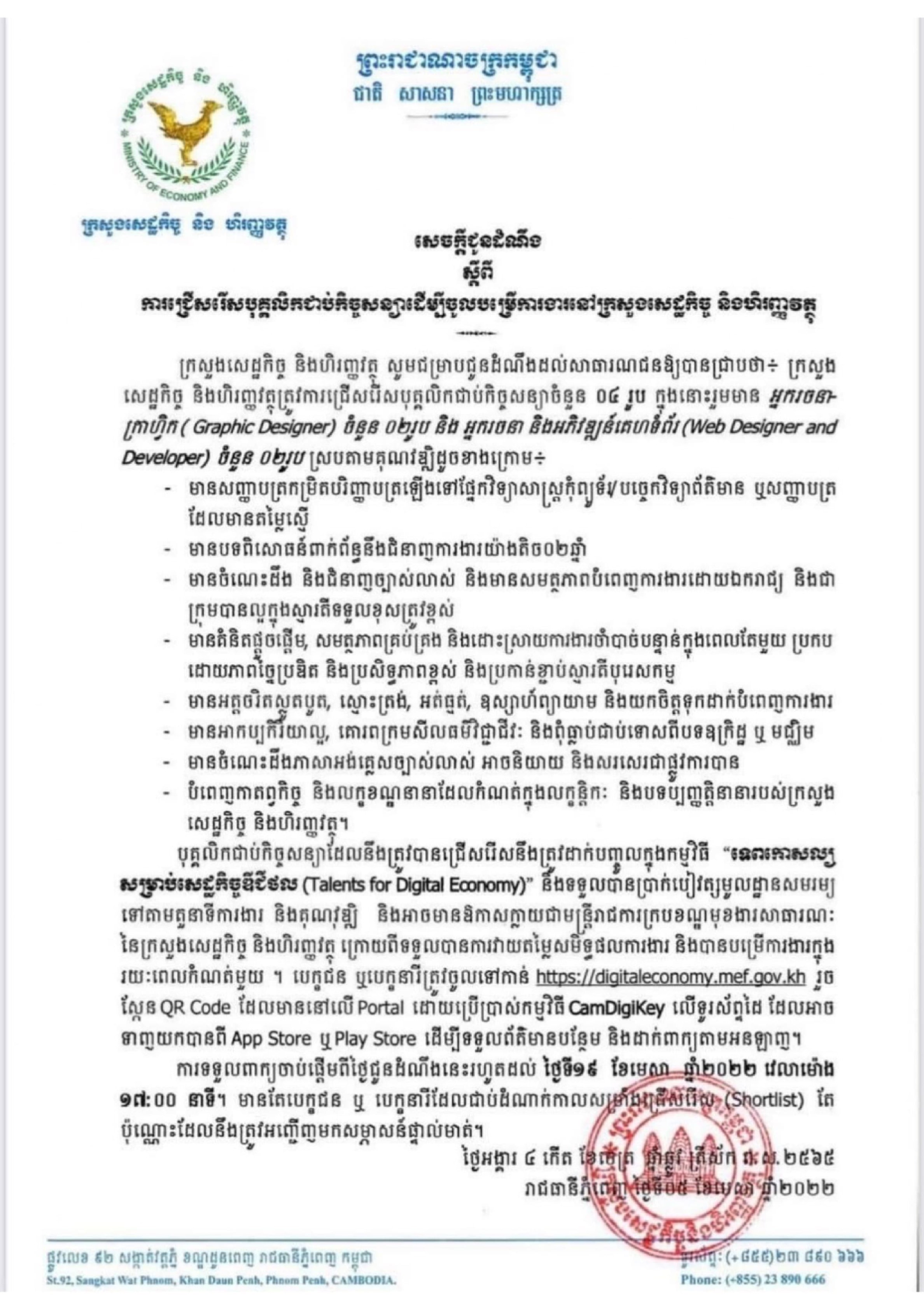 ក្រសួងសេដ្ឋកិច្ចនិងហិរញ្ញវត្ថុ ត្រូវការជ្រើសរើសបុគ្គលិកជាប់កិច្ចសន្យាចំនួន ០៤រូប ក្នុងនោះរួមមាន អ្នករចនា ក្រាហ្វិក (Graphic Designer) ចំនួន ០២រូប និងអ្នករចនា និងអភិវឌ្ឍន៍គេហទំព័រ (Web Designer and Developer) ចំនួន ០២រូប ស្របតាមគុណវឌ្ឍិ។