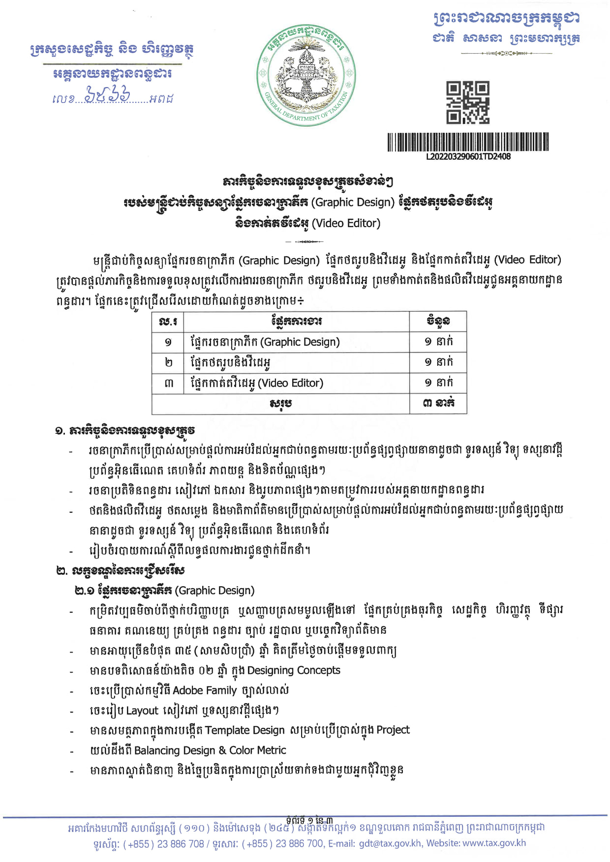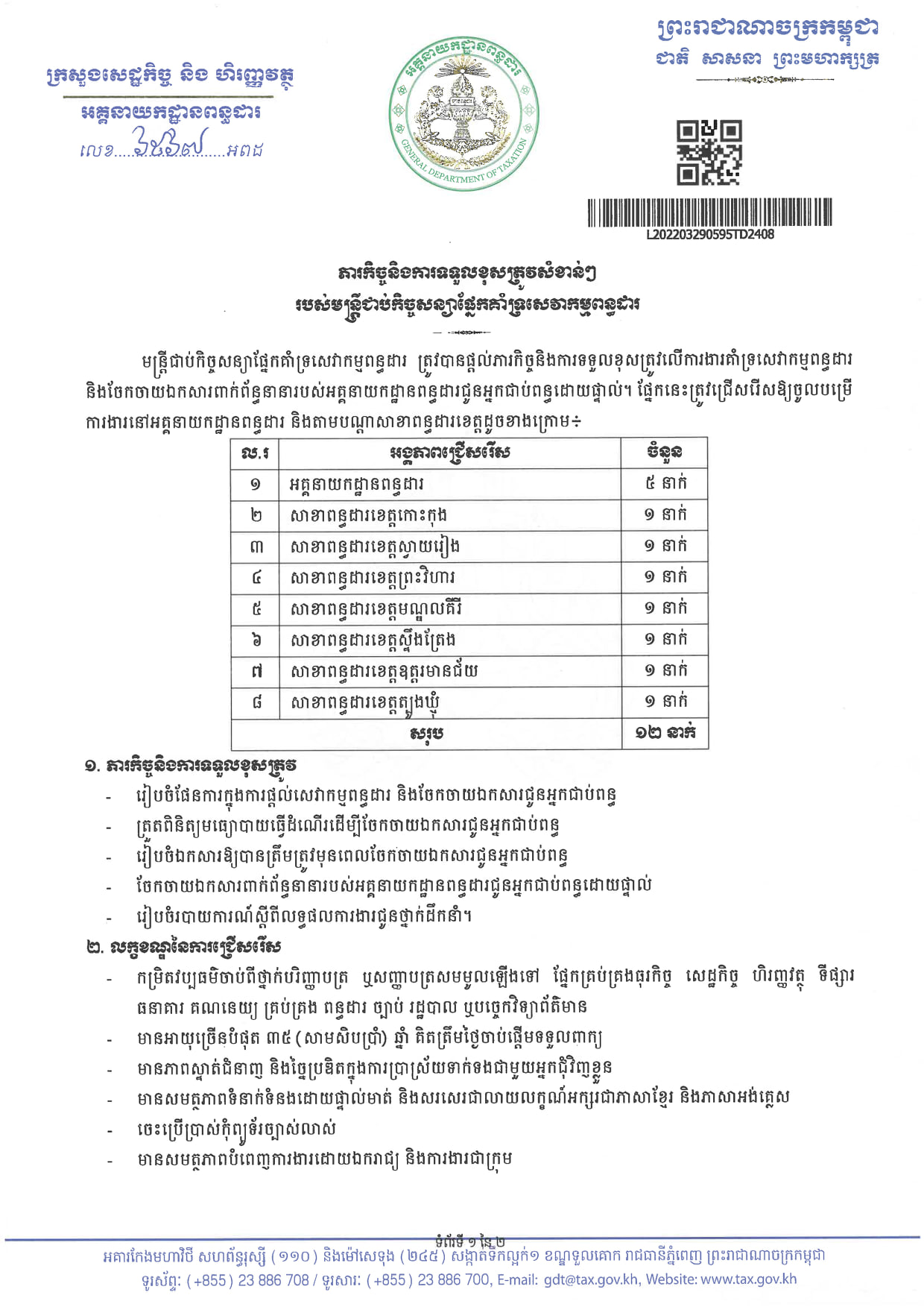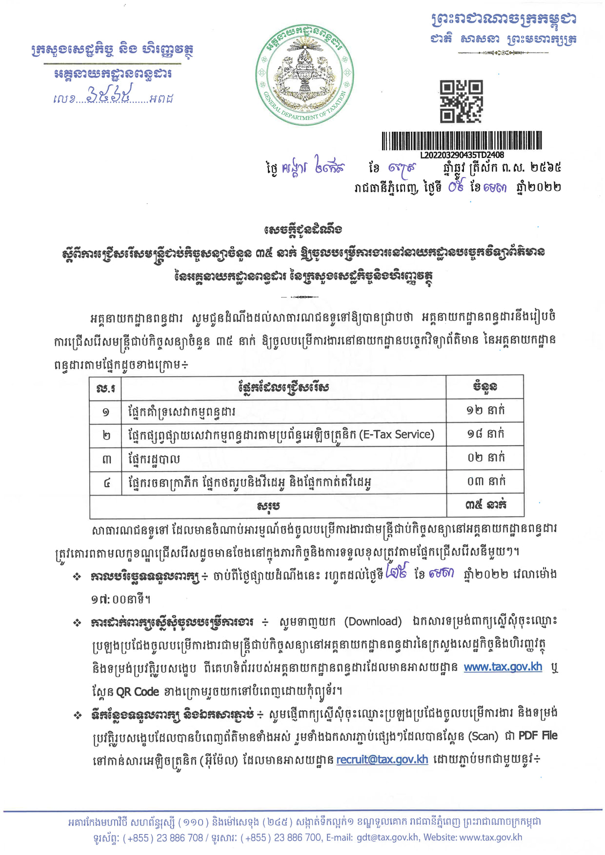អគ្គនាយកដ្ឋានពន្ធដារ សូមជូនដំណឹងដល់សាធារណជនទូទៅឲ្យបានជ្រាបថា អគ្គនាយកដ្ឋានងពន្ធដារ នឹងរៀបចំការជ្រើសរើសមន្ត្រីជាប់កិច្ចសន្យាចំនួន ៣៥នាក់ ឲ្យចូលមកបម្រើការងារនៅនាយកដ្ឋានពន្ធដារបច្ចេកវិទ្យាព័ត៌មាន នៃអគ្គនាយកដ្ឋានពន្ធដារតាមផ្នែកដូចខាងក្រោម៖