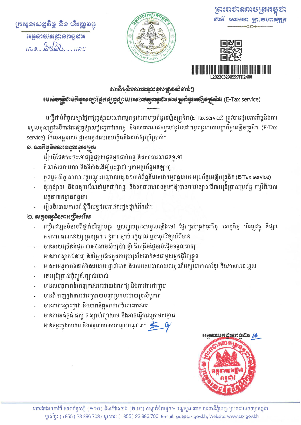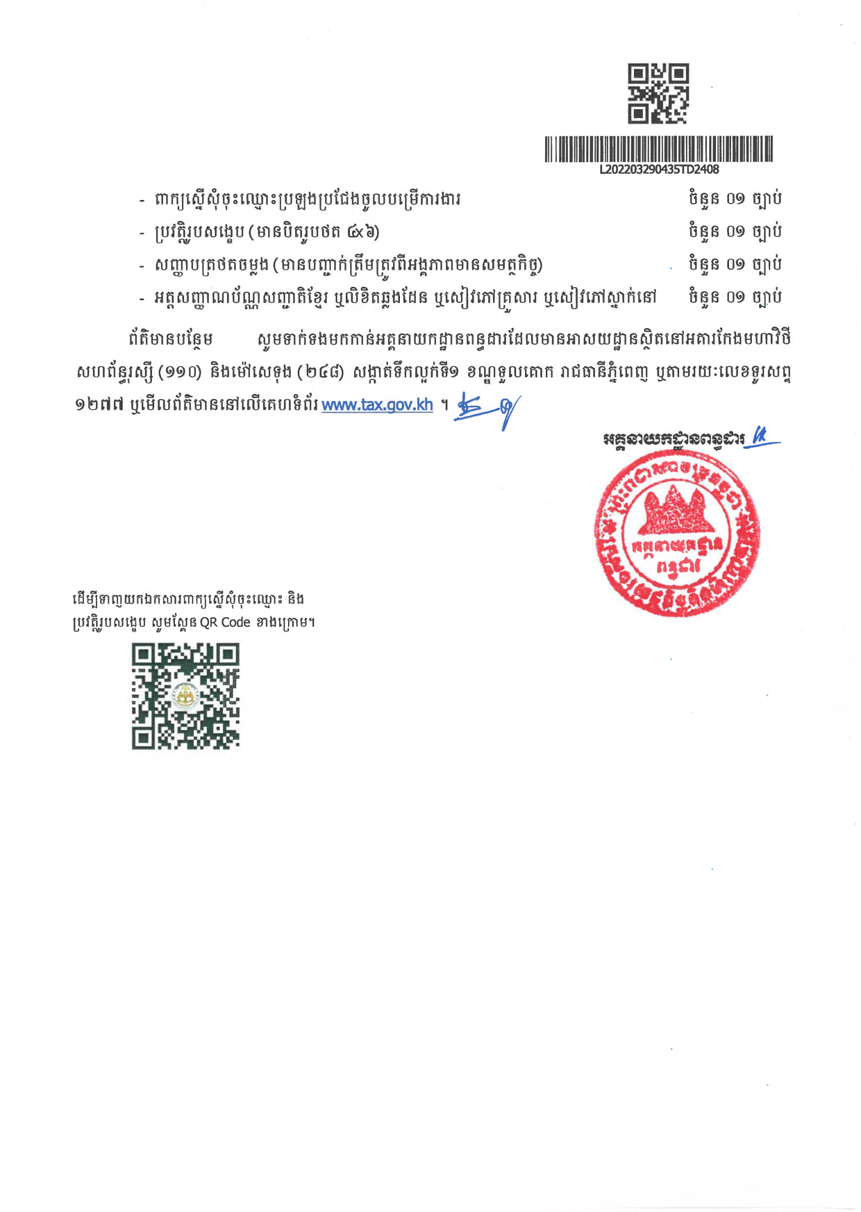 សូមអានសេចក្ដីជូនដំណឹងលម្អិតរបស់ អគ្កនាយកដ្ឋានពន្ធដារ ដូចខាងក្រោម៖