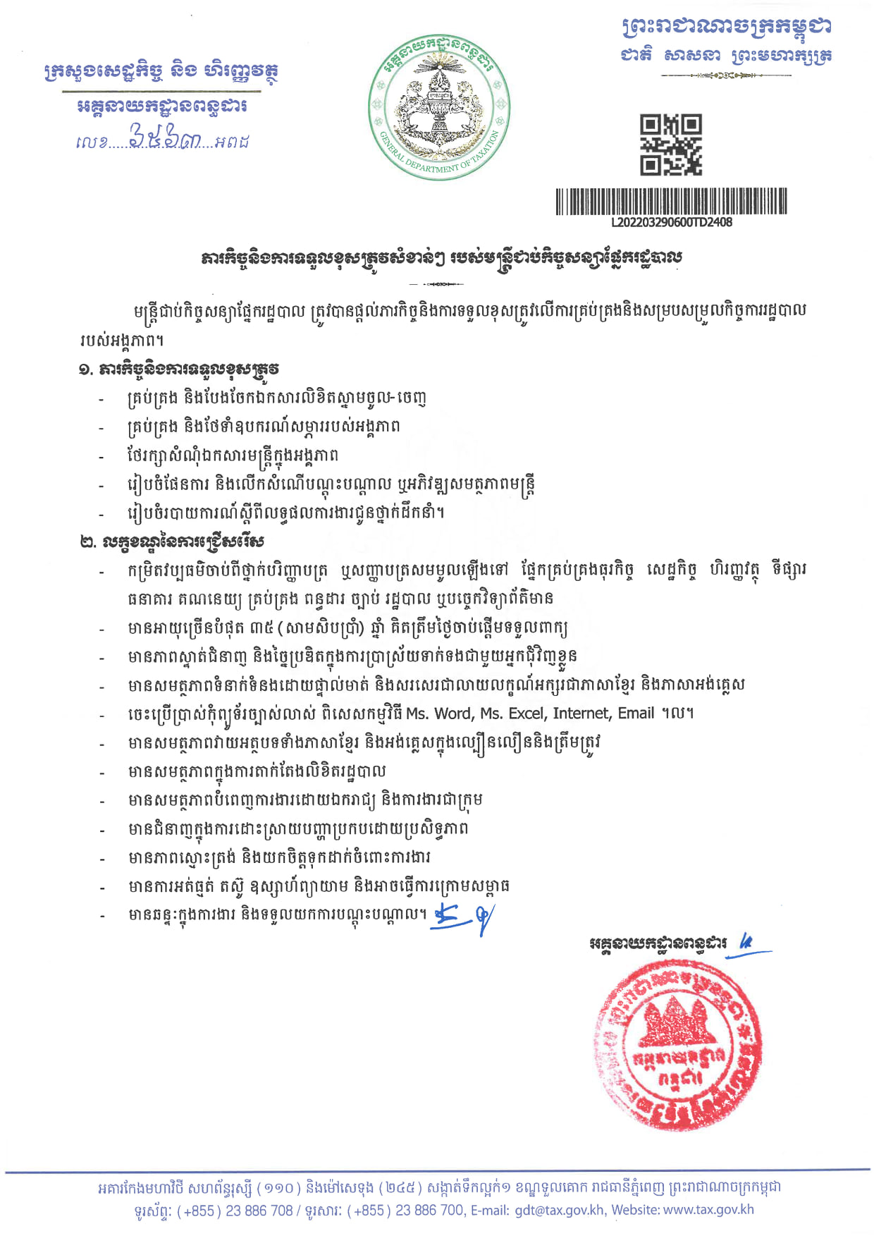 អគ្គនាយកដ្ឋានពន្ធដារ ប្រកាសជ្រើសរើសមន្ត្រីជាប់កិច្ចសន្យាចំនួន ៣៥នាក់ ឱ្យចូលបម្រើការងារនៅក្រសួង ផុតកំណត់ទទួលពាក្យថ្ងៃទី២៥ ខែមេសាខាងមុខ