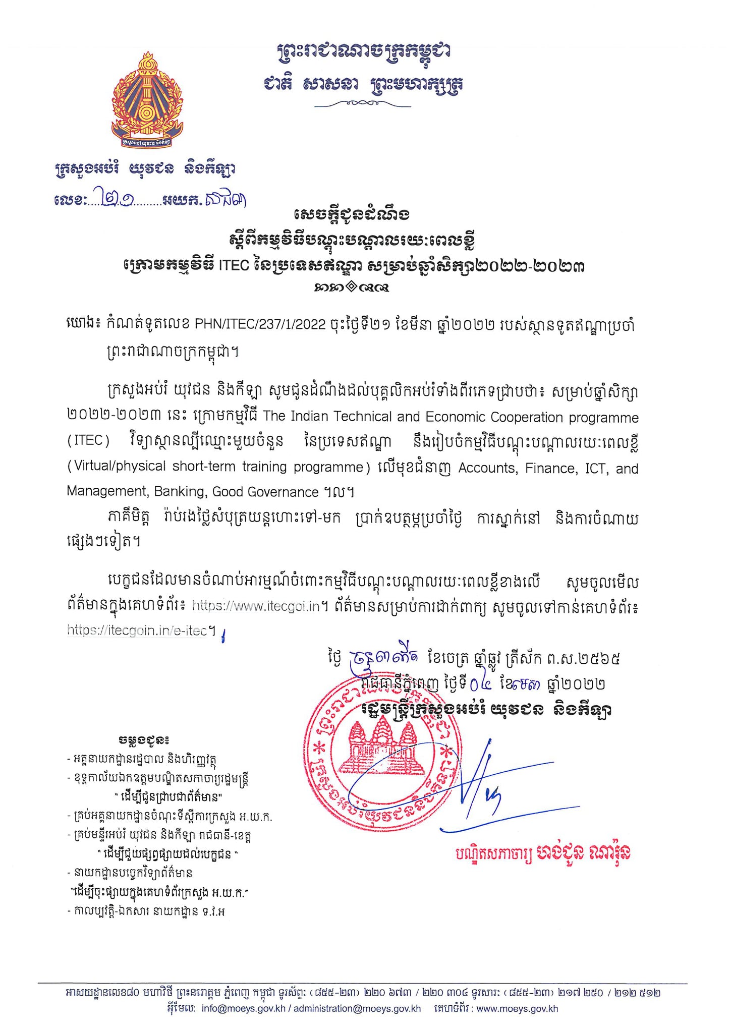 រាចធានីភ្នំពេញ៖ យោងតាមការចុះផ្សាយរបស់ ក្រសួងអប់រំ យុវជន និងកីឡា នៅថ្ងៃទី០៦ ខែមេសា ឆ្នាំ២០២២ បានចេញសេចក្ដីជូនដំណឹងដល់បុគ្គលិកអប់រំទាំងពីរភេទឲ្យជ្រាបថា៖ សម្រាប់ឆ្នាំសិក្សា ២០២២-២០២៣នេះ ក្រោមកម្មវិធី The Indian Technical and Economic Cooperation Programme (ITEC) វិទ្យាស្ថានល្បីឈ្មោះមួយចំនួន នៃប្រទេសឥណ្ឌា នឹងរៀបចំកម្មវិធីបណ្ដុះបណ្ដាលរយៈពេលខ្លី (Virtual/physical short-term training programme) លើមុខជំនាញ Accounts, Finance, ICT, and Management, Banking, Good Governance ។