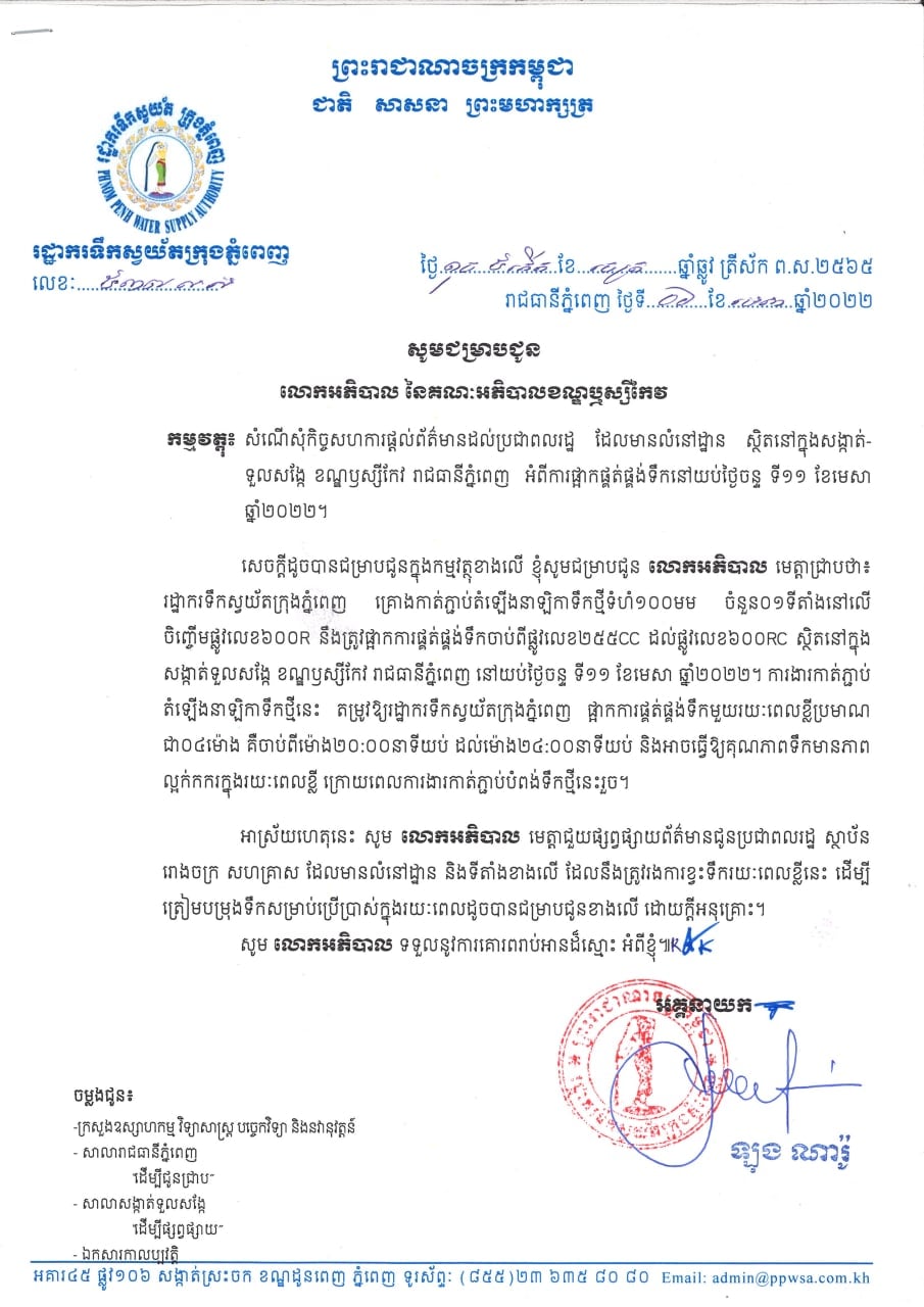 អាស្រ័យហេតុនេះ សូមលោកអភិបាល មេត្តាជួយផ្សព្វផ្សាយព័ត៌មានជូនប្រជាពលរដ្ឋ ស្ថាប័នរោងចក្រ​ សហគ្រាស ដែលមានលំនៅដ្ឋាន និងទីតាំងខាងលើ ដែលនឹងត្រូវរងការខ្វះទឹករយៈពេលខ្លីនេះ ដើម្បីត្រៀមបម្រុងទឹកសម្រាប់ប្រើប្រាស់ក្នុងរយៈពេលដូចបានជម្រាបជូនខាងលើ ដោយក្ដីអនុគ្រោះ ៕
