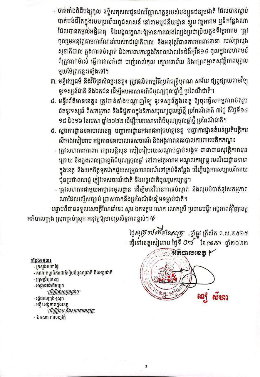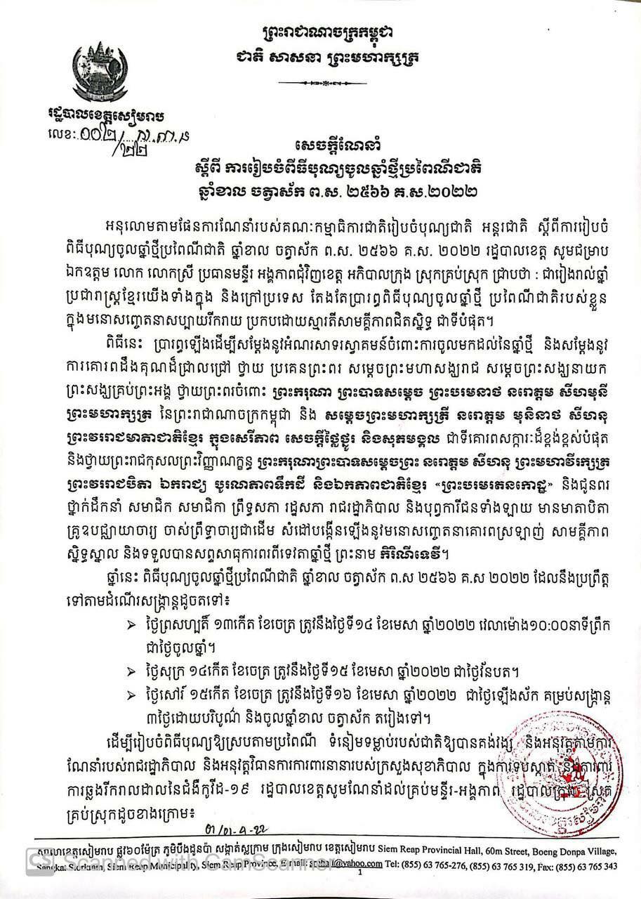 យោងតាមសេចក្តីណែនាំរបស់ រដ្ឋបាលខេត្តសៀមរាប បានឲ្យដឹងថា ដើម្បីរៀបចំពិធីបុណ្យចូលឆ្នាំថ្មីប្រពៃណីជាតិ ឆ្នាំខាល ចត្វាស័ក ព.ស. ២៥៦៦ គ.ស.២០២២ ឲ្យស្របតាមប្រពៃណី ទំនៀមទម្លាប់របស់ជាតិឲ្យបានគង់វង្ស និងអនុវត្តតាមការណែនាំរបស់រាជរដ្ឋាភិបាល និងអនុវត្តវិធានការការពារនានារបស់ក្រសួងសុខាភិបាល ក្នុងការទប់ស្កាត់ និងការពារការឆ្លងរីករាលដាលនៃជំងឺកូវីដ-១៩ រដ្ឋបាលខេត្តសៀមរាបសូមណែនាំដល់គ្រប់មន្ទីរ-អង្គភាព រដ្ឋបាលក្រុង-ស្រុក គ្រប់ស្រុកដូចខាងក្រោម៖