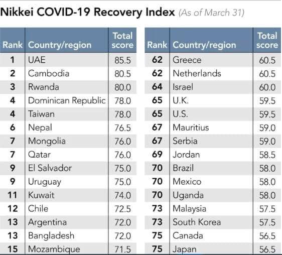 នៅក្នុងតារាងវាយតម្លៃរបស់ Nikkei ៖ ប្រទេសដែលឈរនៅលេខរៀងទី១ ដែលមានសមត្ថភាពស្ដារខ្លួនងើបចេញពី COVID-19 លឿនជាងគេនៅលើពិភពលោកគឺអេមីរ៉ាតអារ៉ាប់រួម ដោយទទួលបាន ៨៥.៥ពិន្ទុ ខណៈកម្ពុជាឈរនៅលេខរៀងទី២ មាន ៨០.៥ពិន្ទុ៕