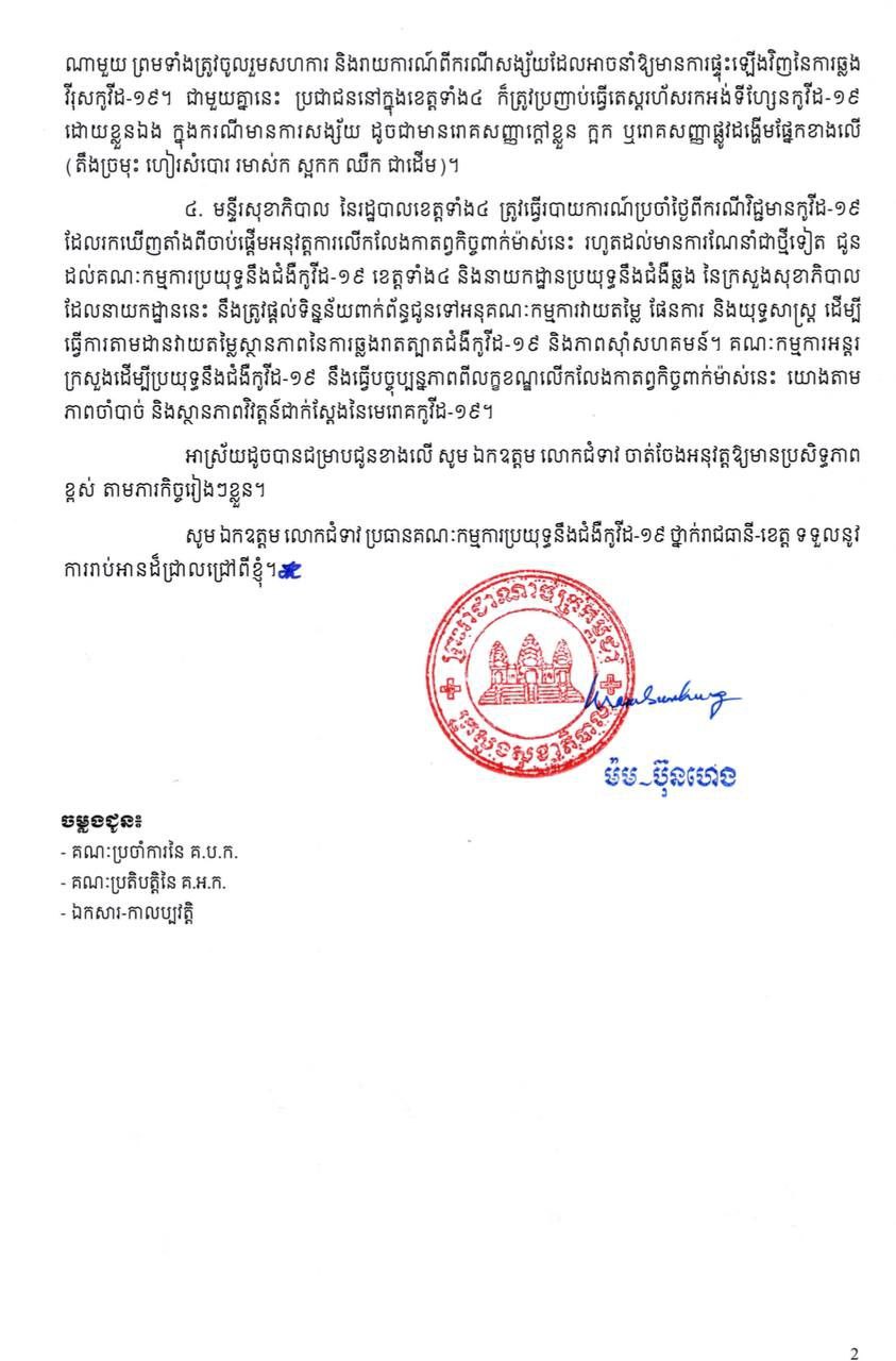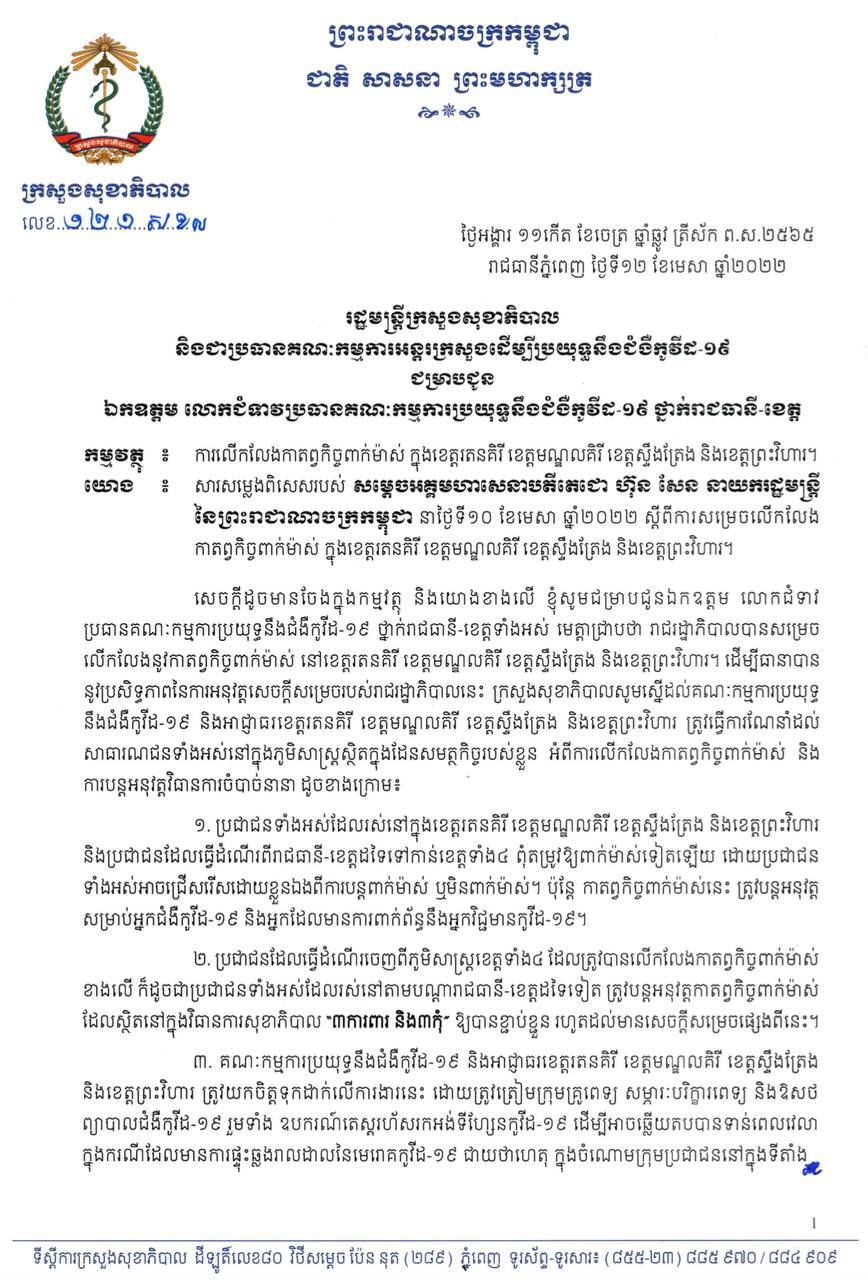 ក្រសួងសុខាភិបាល សូមជម្រាបជូនដល់ថ្នាក់រាជធានី-ខេត្តទាំងអស់ មេត្តាជ្រាបថា រាជរដ្ឋាភិបាលបានសម្រេចលើកលែងនូវភាពព្វកិច្ចពាក់ម៉ាស់ នៅខេត្តរតនគិរី ខេត្តមណ្ឌលគិរី ខេត្តស្ទឹងត្រែង និងខេត្តព្រះវិហារ ។ ដើម្បីធានាបាននូវប្រសិទ្ធភាពនៃការអនុវត្តសម្រេចរបស់រាជរដ្ឋាភិបាលនេះ ក្រសួងសុខាភិបាលសូមស្នើដល់គណៈកម្មការប្រយុទ្ធ នឹងជំងឺកូវីដ-១៩ និងអាជ្ញាធរខេត្តរតនគិរី ខេត្តមណ្ឌលគិរី ខេត្តស្ទឹងត្រែង​ និងខេត្តព្រះវិហារ ត្រូវធ្វើការណែនាំដល់សាធារណជន ទាំងអស់នៅក្នុងភូមិសាស្ត្រស្ថិតក្នុងដែនសមត្ថកិច្ចរបស់ខ្លួន អំពីការលើកលែងកាតព្វកិច្ចពាក់ម៉ាស និងការបន្តអនុវត្តវិធានការចំបាច់នានា ដូចខាងក្រោម៖