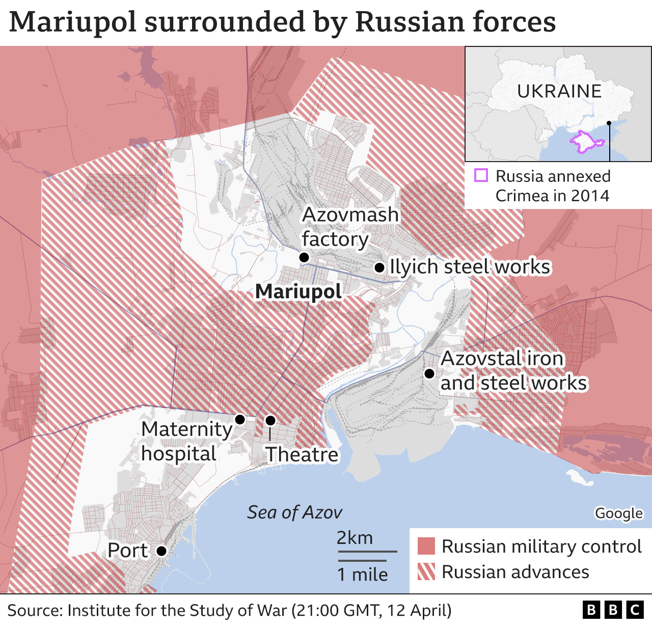 ជម្រាបដែរថា Mariupol គឺជាកំពង់ផែដ៏សំខាន់ និងជាគោលដៅសំខាន់សម្រាប់ប្រទេសរុស្ស៊ី ខណៈដែលខ្លួនស្វែងរកការបង្កើតផ្លូវគោកទៅកាន់ឧបទ្វីប Crimea ដែលរុស្ស៊ីបានដាក់បញ្ចូលក្រោមការគ្រប់គ្រងរបស់ខ្លួនក្នុងឆ្នាំ២០១៤។ ទីក្រុងនេះជាចំណុចសំខាន់នៃការវាយប្រហារដ៏សាហាវដោយកងកម្លាំងរុស្ស៊ី ហើយទាហានអ៊ុយក្រែននៅទីនោះបាននិយាយថា ពួកគេកំពុងអស់គ្រាប់ដើម្បីទប់ទល់ការវាយប្រហារ។ កាលពីព្រឹកថ្ងៃពុធ អ្នកកាសែត រ៉យទ័រ បានឃើញអណ្តាតភ្លើងឆាបឆេះចេញពីរោងចក្រដែក Azovstal ដែលជាកន្លែងដែលទាហានម៉ារីនមកពីកងពលតូចទី៣៦ ត្រូវបានបង្ខាំងអស់រយៈពេលជាច្រើនសប្តាហ៍៕