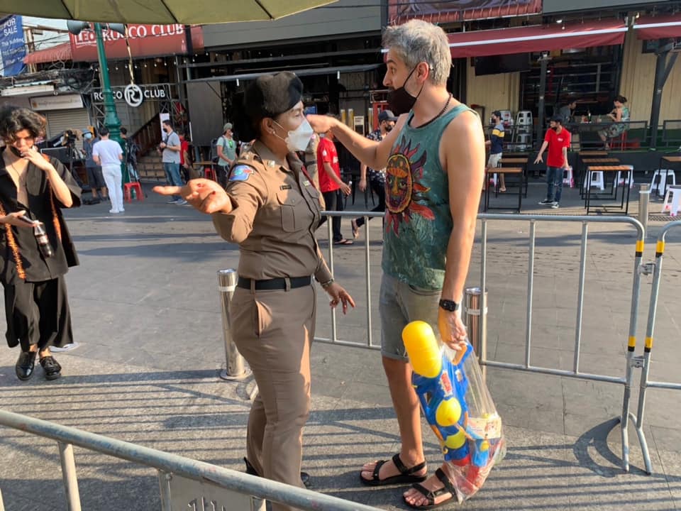 កាលពីថ្ងៃព្រហស្បតិ៍ម្សិលមិញនេះ តម្រួតថៃបានរឹបអូសកាំភ្លើងបាញ់ទឹកពីអ្នកលក់ដូរ និងអ្នកដើរលេងតាមផ្លូវ Khaosan ខណៈដែលប៉ុស្តិ៍ត្រួតពិនិត្យជាច្រើនត្រូវបានដាក់ឡើង ដើម្បីអនុវត្តការហាមប្រាមមិនឱ្យមានការលេងបាញ់ទឹក។ អ្នកនាំពាក្យរដ្ឋាភិបាលលោក Thanakorn Wangboonkongchana មានប្រសាសន៍ថា នាយករដ្ឋមន្ត្រី ប្រាយុទ្ធ ចាន់អូចា មានការព្រួយបារម្ភថា ការលេងបាញ់ ឬជះទឹក អាចនាំឱ្យមានចង្កោមករណីជំងឺ COVID ថ្មីៗ ហើយលោកបានបញ្ជាឱ្យអាជ្ញាធរអនុវត្តវិធានការសុខភាពយ៉ាងតឹងរ៉ឹង។