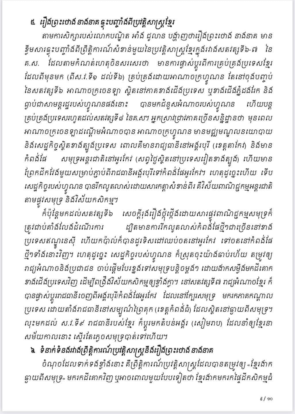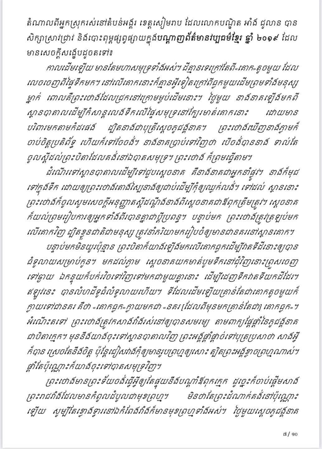 ខ្មែរក៏ដូចជាជាតិសាសន៍ដទៃទៀត គឺមានរឿងព្រេងនិទានអំពីដើមកំណើតទឹកដី និងដើមកំណើតបុព្វការីជនដំបូងបង្អស់របស់ខ្លួន។ រឿងព្រេងទាំងនោះ មានចារក្នុងសិលាចារឹក, កត់ត្រាក្នុងកំណត់ហេតុចិន, មាននៅក្នុងឯកសារពង្សាវតារ ឬ របាក្សត្រ ហើយរឿងខ្លះទៀតស្ថិតនៅក្នុងស្មារតីចងចាំរបស់ខ្មែររហូតមកដល់សព្វថ្ងៃ។ សាច់រឿងទាំងនេះមានសារៈប្រយោងជន៍យ៉ាងខ្លាំងចំពោះអារ្យធម៌ខ្មែរទាំងមូល និងបណ្ដុះស្មារតីប្រជាជនកម្ពុជាឲ្យមានឧត្តមគតិស្រលាញ់វប្បធម៌និងជាតិមាតុភូមិរបស់ខ្លួន។