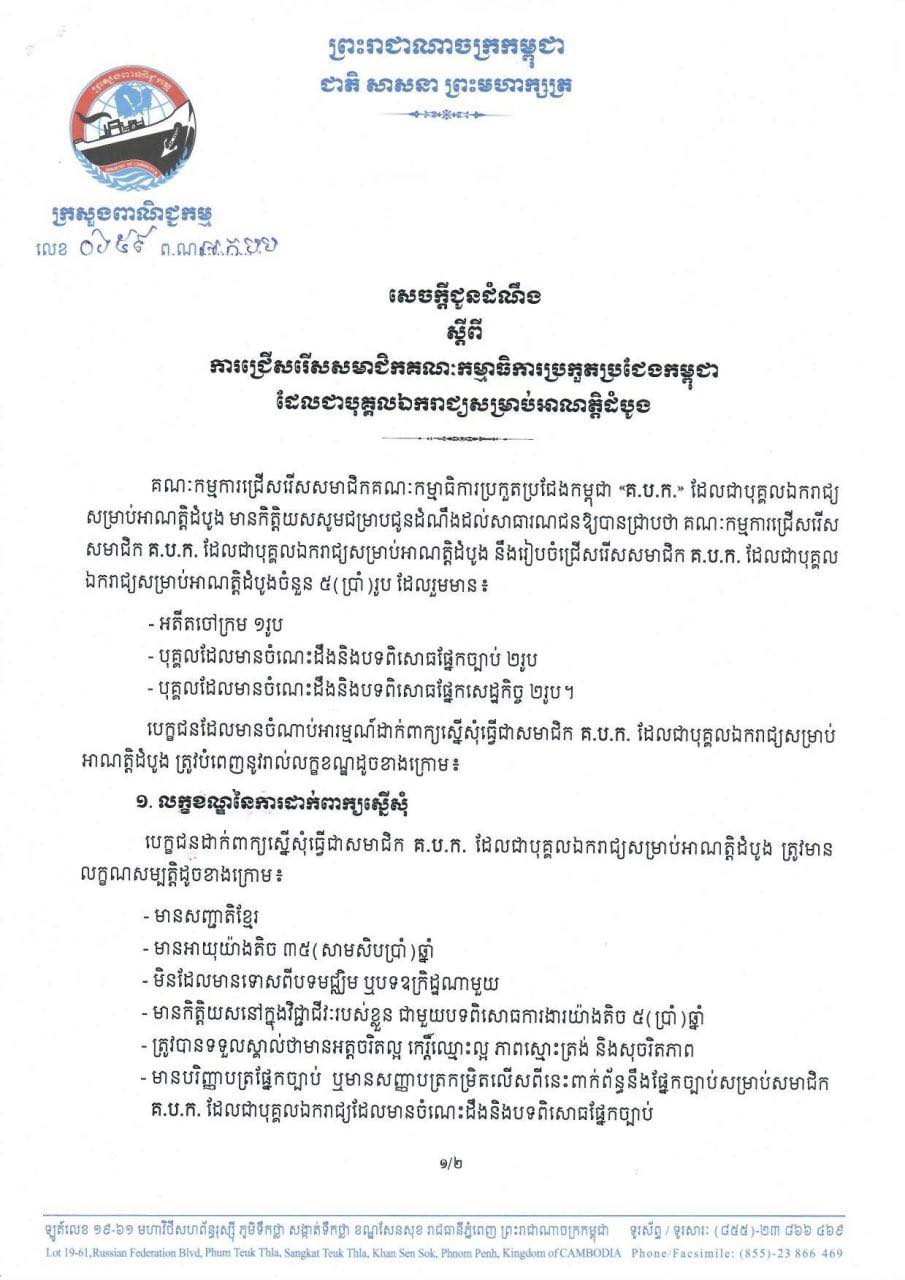 គណៈកម្មការជ្រើសរើសសមាជិកគណៈកម្មាធិការប្រកួតប្រជែងកម្ពុជា “គ.ប.ក” ដែលជាបុគ្គលឯករាជ្យសម្រាប់អាណត្តិដំបូង មានកិត្តិយសសូមជម្រាបជូនដំណឹងដល់សាធារណជនឲ្យបានជ្រាបថា គណៈកម្មការជ្រើសរើសសមាជិក គ.ប.ក ដែលជាបុគ្គលឯករាជ្យសម្រាប់អាណត្តិដំបូង នឹងរៀបចំជ្រើសរើសសមាជិក គ.ប.ក ដែលជាបុគ្គលឯករាជ្យសម្រាប់អាណត្តិដំបូងចំនួន ៥រូប ដែលរួមមាន៖