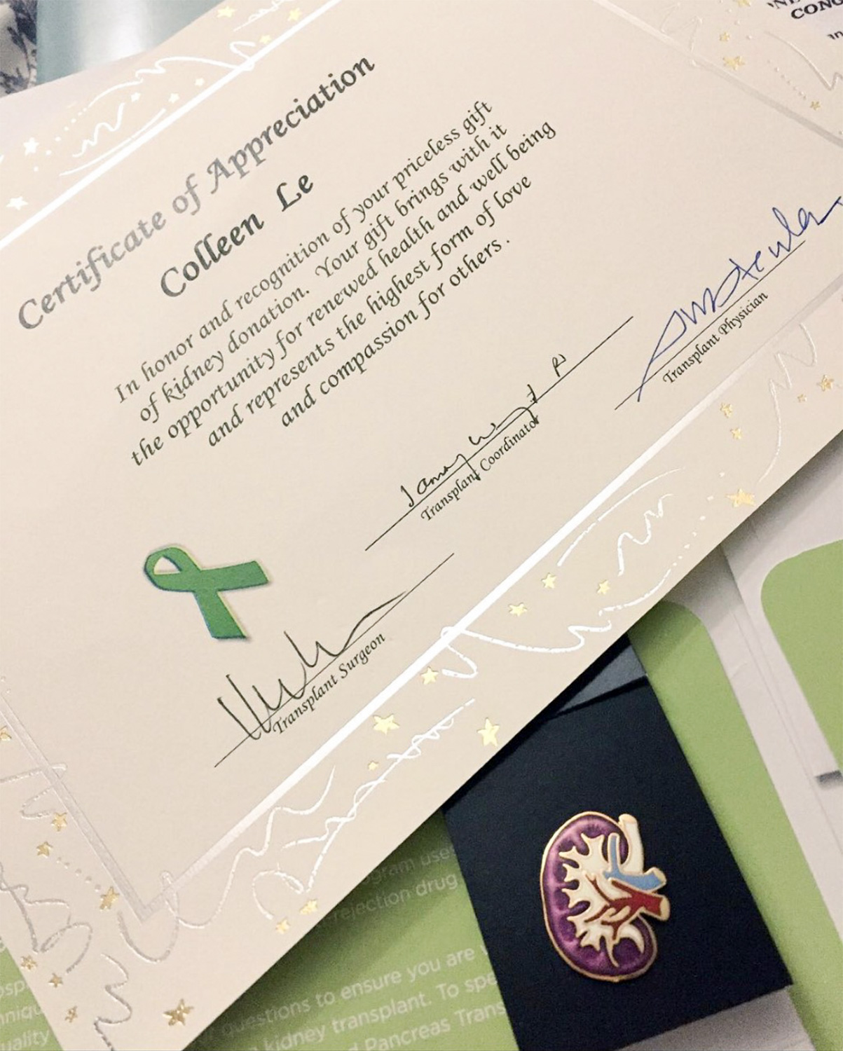 ការបរិច្ចាគក្រលៀនអោយនរណាម្នាក់មិនមែនជារឿងងាយៗឡើយ ប៉ុន្តែចំពោះ កញ្ញា Colleen Le អាយុ ៣០ឆ្នាំ ដែលបច្ចុប្បន្នរស់នៅតំបន់ Orange County ភាគខាងត្បូងរដ្ឋ California បានឲ្យដឹងថា កញ្ញាមានឱកាសការពារជីវិតអោយមិត្តប្រុសរបស់នាងកាលពី ៦ឆ្នាំមុន។ នៅពេលនោះនាងស្ទើរតែមិនបានគិតឡើយថា ខ្លួននាងព្រមនឹងប្រថុយជីវិតដើម្បីរក្សាទុកមិត្តប្រុសដែលមានជម្ងឺក្រលៀនរ៉ាំរ៉ៃ តាំងពីអាយុ១៧ឆ្នាំ ពោលគឹមិត្តប្រុសរបស់នាងត្រូវលាងឈាមជាប្រចាំ ដោយចំនួនភាគរយនៃក្រលៀនរបស់មិត្តប្រុសនាងសល់ត្រឹមតែ ៥%តែប៉ុណ្ណោះ។
