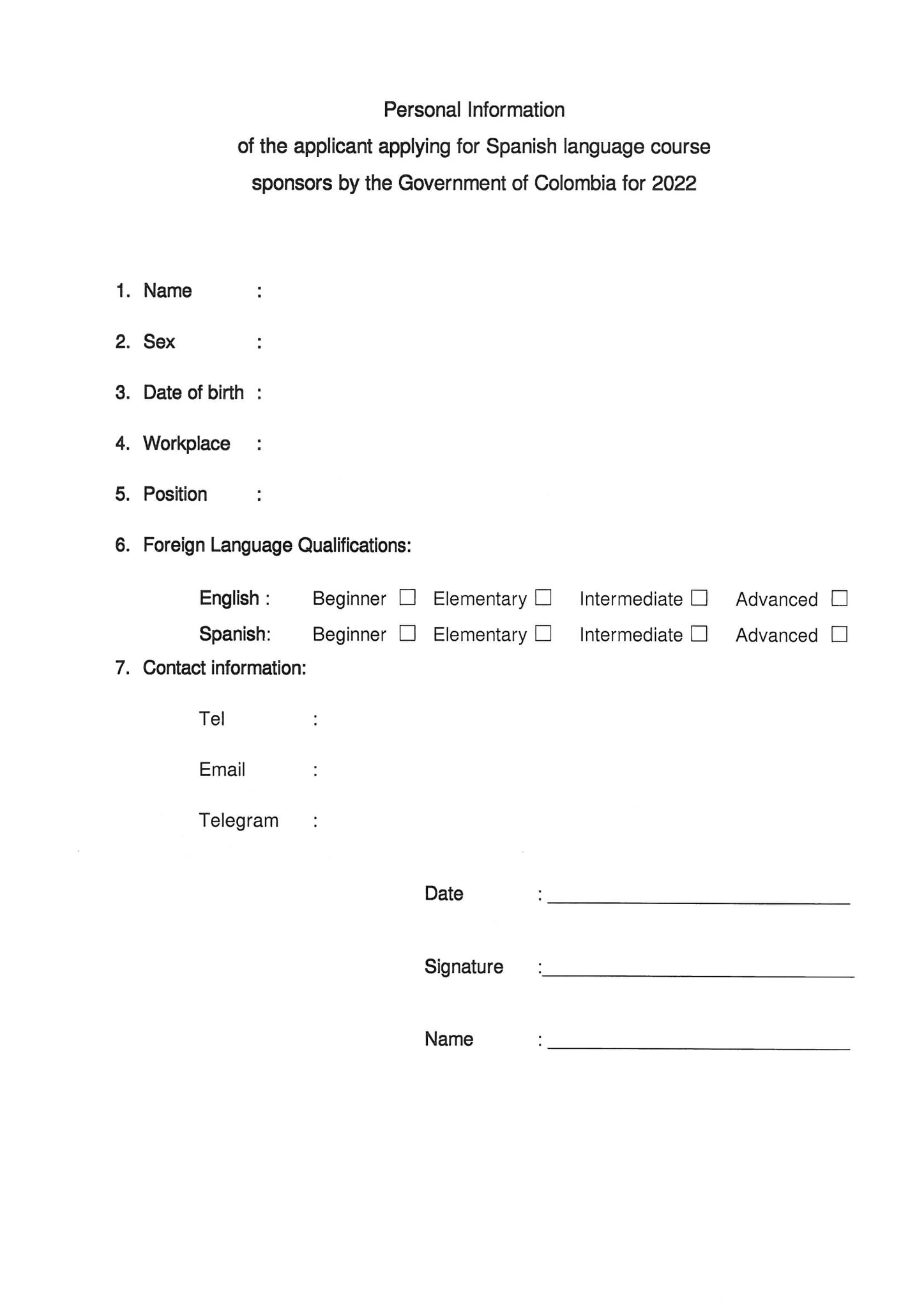 សម្រាប់ឆ្នាំ២០២២នេះ រដ្ឋាភិបាលកូឡុំប៊ី បានសម្រេចផ្ដល់វគ្គសិក្សាភាសាអេស្ប៉ាញតាម Online កម្រិតមូលដ្ឋាន មធ្យម និងខ្ពស់ដល់មន្រ្តីរាជការ (ជាពិសេសមន្រ្តីទទួលបន្ទុកការងារទំនាក់ទំនងអន្តរជាតិ) និងមន្រ្តីការទូត ដោយការសិក្សានឹងចាប់ផ្ដើមនៅពាក់កណ្ដាលខែកក្កដា ឆ្នាំ២០២២តទៅ។
