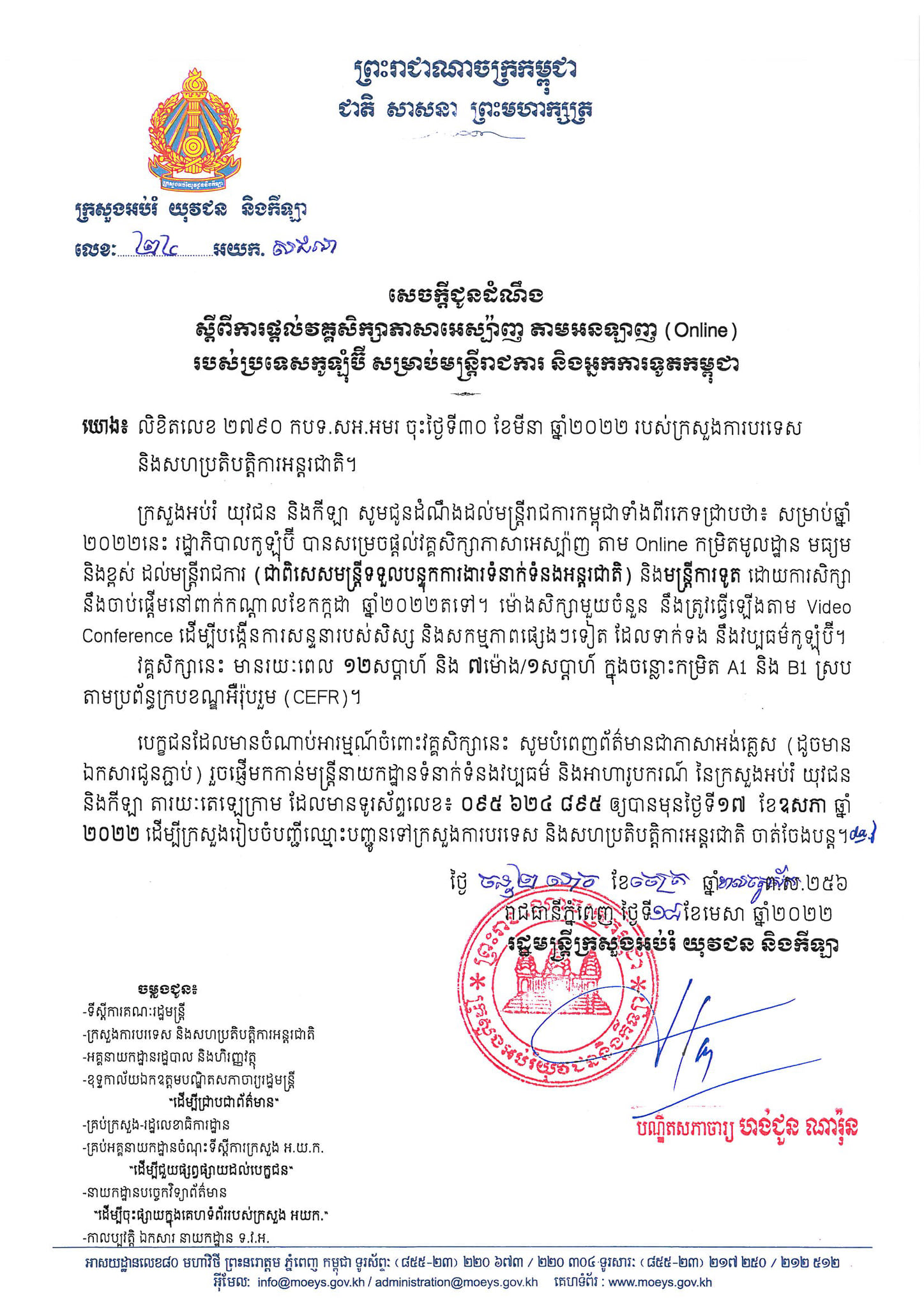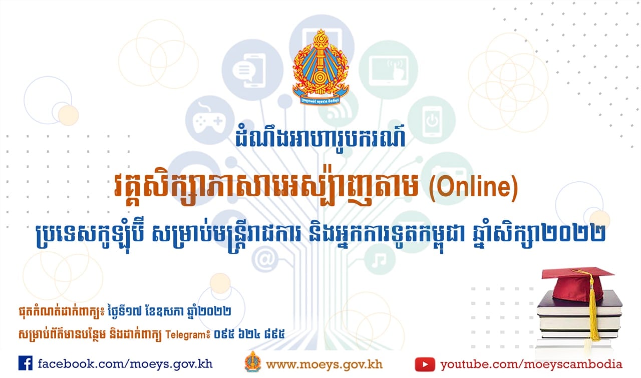 រាជធានីភ្នំពេញ៖ យោងតាមការចុះផ្សាយរបស់ ក្រសួងអប់រំ យុវជន និងកីឡា នៅថ្ងៃទី១៩ ខែមេសា ឆ្នា២០២២ បានឲ្យដឹងថា ក្រសួងអប់រំ សូមជូនដំណឹងដល់មន្រ្តីរាជការកម្ពុជាទាំងពីរភេទស្ដីពីការផ្ដល់វគ្គសិក្សាភាសាអេស្ប៉ាញ តាមអនឡាញ(Online) របស់ប្រទេសកូឡុំប៊ី សម្រាប់មន្ត្រីរាជ និងអ្នកការទូតកម្ពុជា។