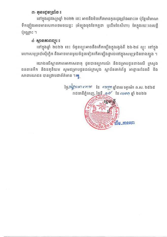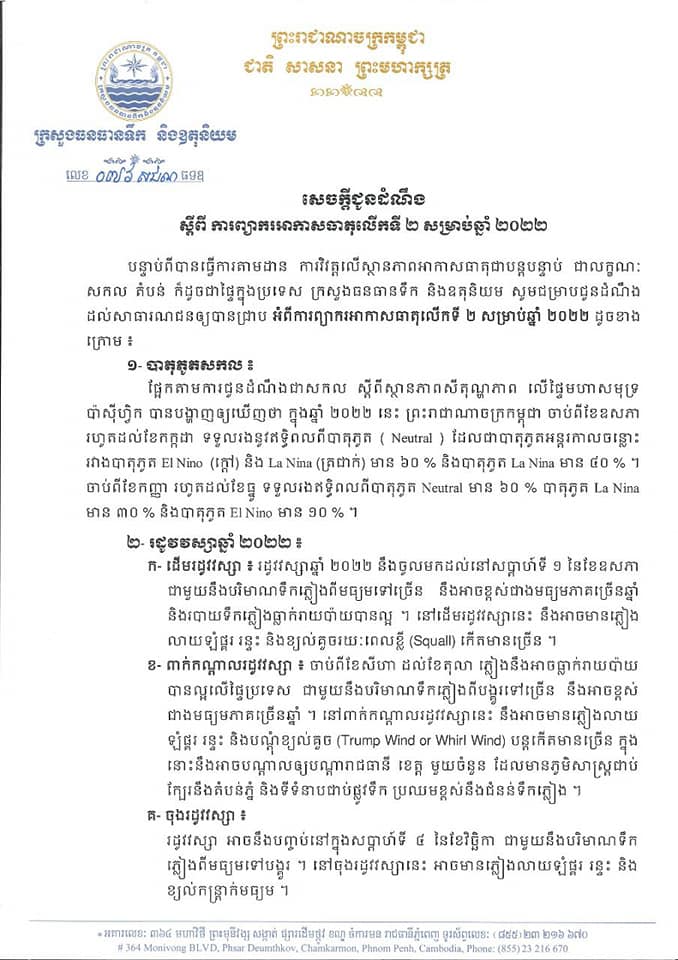បន្ទាប់ពីបានធ្វើការតាមដាន ការវិវត្តលើស្ថានភាពអាកាសធាតុជាបន្តបន្ទាប់ ជាលក្ខណៈសកល តំបន់ ក៏ដូចជាផ្ទៃក្នុងប្រទេស ក្រសួងធនធានទឹក និងឧតុនិយម សូមជម្រាបជូនដំណឹងដល់សាធារណជនឲ្យបានជ្រាបថា អំពីការព្យាករអាកាសធាតុលើកទី២ សម្រាប់ឆ្នាំ២០២២ ដូចខាងក្រោម៖