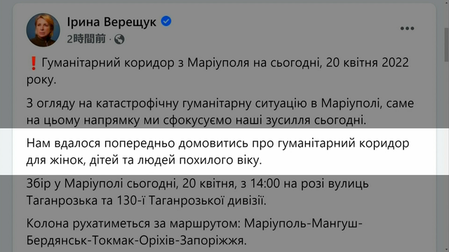 ឧបនាយករដ្ឋមន្ត្រីអ៊ុយក្រែន លោកស្រី Iryna Vereshchuk បាននិយាយថា ប្រទេសរបស់អ្នកស្រីបានយល់ព្រមជាមួយរុស្ស៊ី ដើម្បីបង្កើតផ្លូវជម្លៀសចេញពីទីក្រុង Mariupol ភាគខាងកើត សម្រាប់ស្ត្រី កុមារ និងមនុស្សចាស់។ លោក Vereshchuk បានធ្វើសេចក្តីប្រកាសនៅលើបណ្ដាញសង្គម Facebook កាលពីថ្ងៃពុធ ហើយបានប្រាប់ពីទីតាំងមួយ ដើម្បីឱ្យពលរដ្ឋមកជួបជុំគ្នានៅម៉ោង ២ រសៀល (ម៉ោងក្នុងស្រុក) ។ លោកស្រីបាននិយាយថា អ្នកដែលចង់ជម្លៀសចេញ នឹងត្រូវដឹកជញ្ជូនទៅកាន់តំបន់ Zaporizhzhia ។