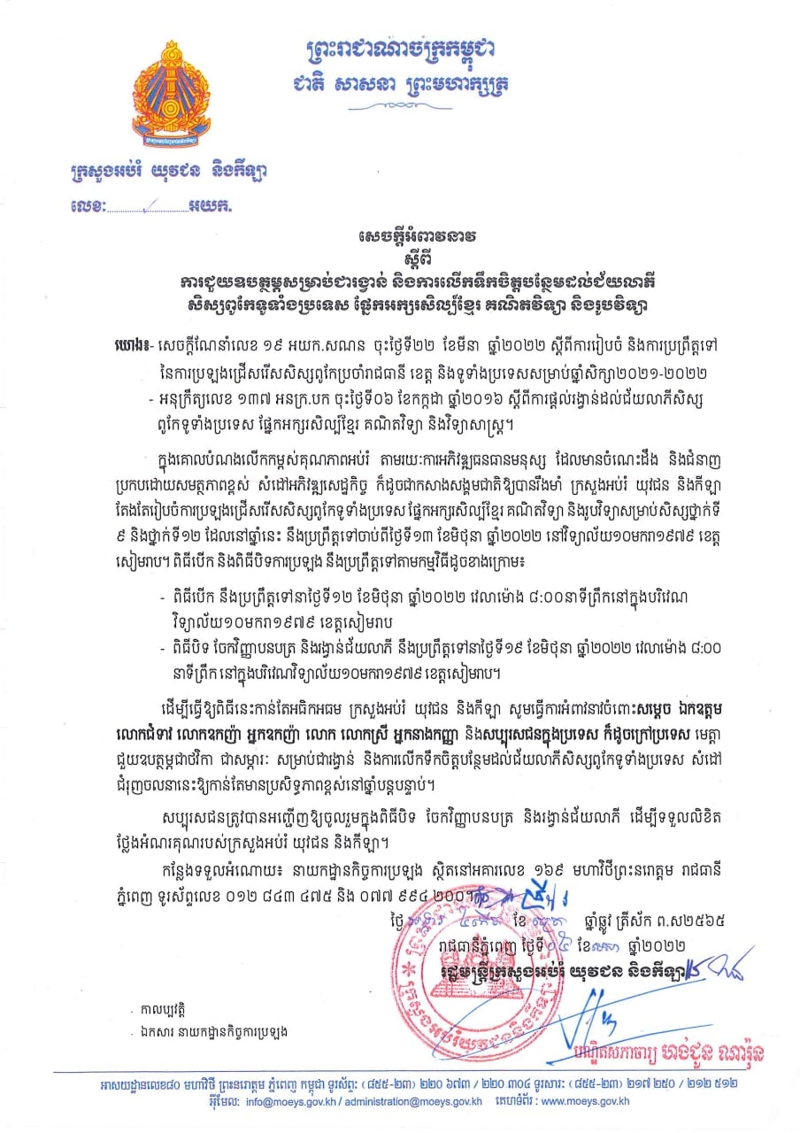 រាជធានីភ្នំពេញ៖ យោងតាមការចុះផ្សាយរបស់ ក្រសួងអប់រំ យុវជន និងកីឡា នៅថ្ងៃទី២១ ខែមេសា ឆ្នាំ២០២២ បានចេញសេចក្ដីអំពាវនាវស្ដីពី ការជួយឧបត្ថម្ភសម្រាប់ជារង្វាន់ និងការលើកទឹកចិត្តបន្ថែមដល់ជ័យលាភីសិស្សពូកែទូទាំងប្រទេស ផ្នែកអក្សរសិល្ប៍ខ្មែរ គណិតវិទ្យា និងរូបវិទ្យា។