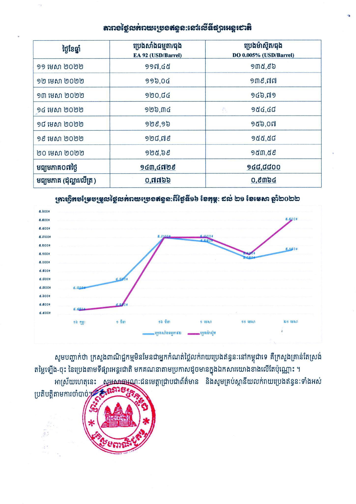រាជធានីភ្នំពេញ៖ យោងតាមលិខិតរបស់ក្រសួងពាណិជ្ជកម្ម ចុះផ្សាយថ្ងៃទី២១ ខែមេសា ឆ្នាំ២០២២ ស្តីអំពីតម្លៃលក់រាយប្រេងឥន្ធនៈនៅតាមស្ថានីយទាំងអស់ក្នុងព្រះរាជាណាចក្រកម្ពុជាសម្រាប់អនុវត្តទៅតាមតម្លៃមធ្យមប្រេងឥន្ធនៈលើទីផ្សារអន្តរជាតិ ចាប់ពីថ្ងៃទី២១ ដល់ថ្ងៃទី៣០ ខែមេសា ឆ្នាំ២០២២ បានឲ្យដឹងថា តម្លៃប្រេងសាំងធម្មតាមានតម្លៃ ៥,១៥០រៀលក្នុងមួយលីត្រ ចំណែកឯប្រេងសាំងម៉ាស៊ូតមានតម្លៃ ៥,៥០០រៀលក្នុងមួយលីត្រប៉ុណ្ណោះ។