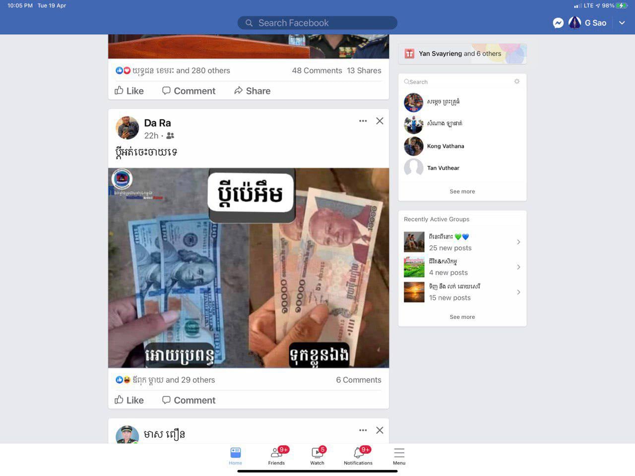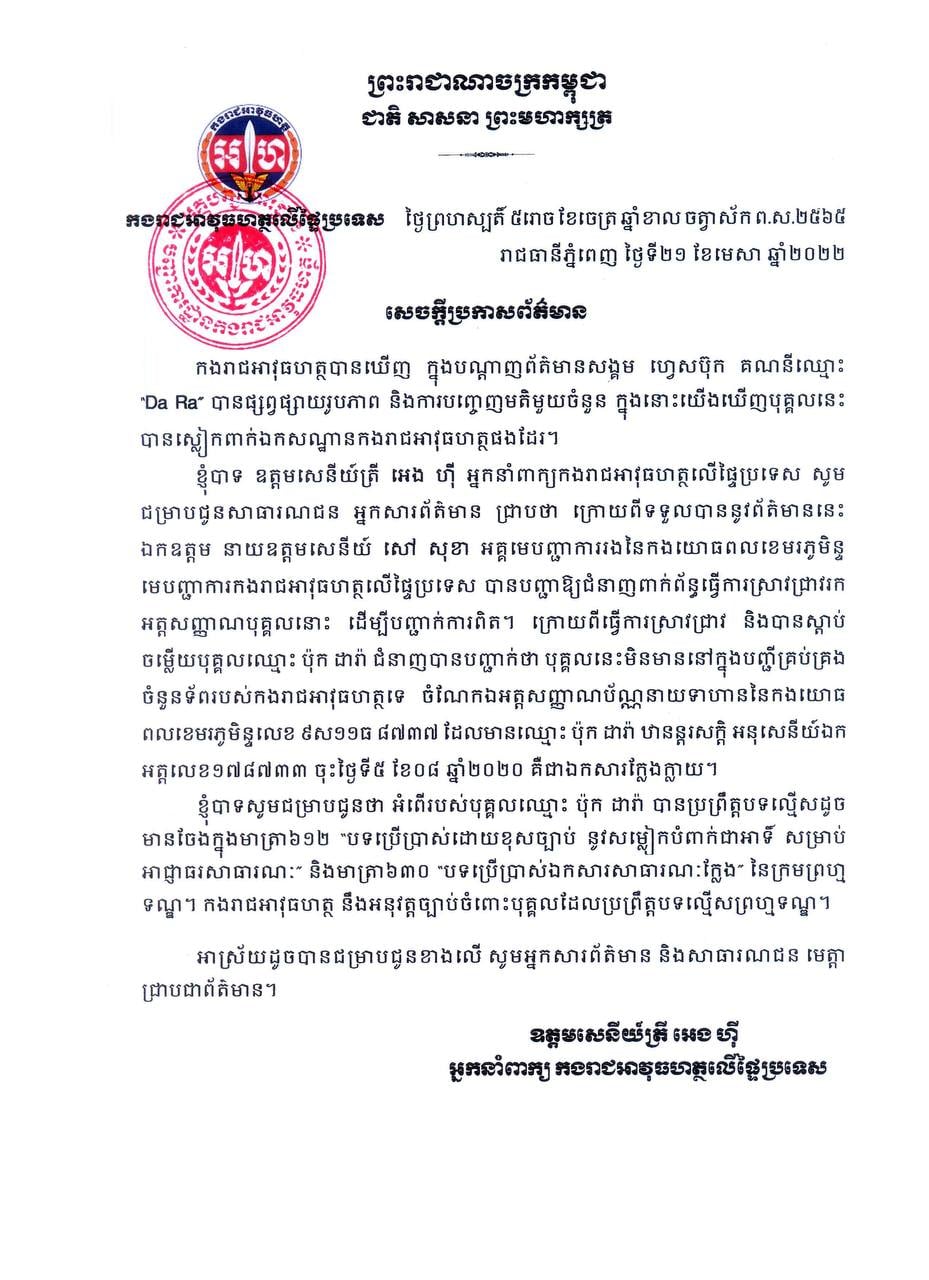 កងរាជអាវុធហត្ថបានឃើញ ក្នុងបណ្ដាញព័ត៌មានសង្គមហ្វេសប៊ុក គណនីឈ្មោះ “Da Ra” បានផ្សព្វផ្សាយរូបភាព និងការបញ្ចេញមតិមួយចំនួន ក្នុងនោះយើងឃើញបុគ្គលនេះ បានស្លៀកពាក់ឯកសណ្ឋានកងរាជអាវុធហត្ថផងដែរ។