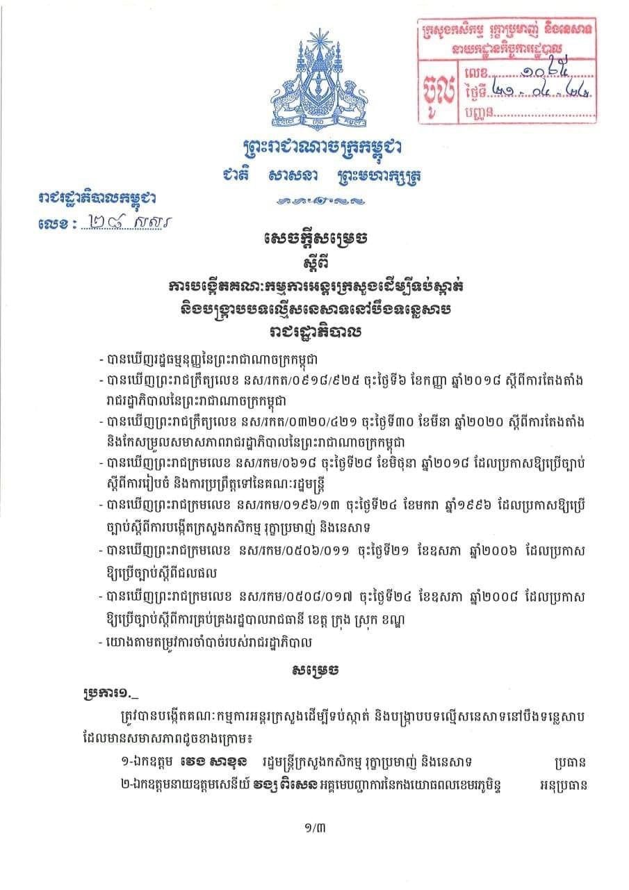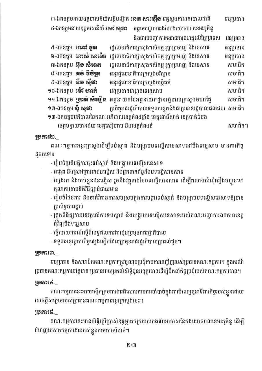 ក្នុងលិខិតសម្រេចរបស់ រាជរដ្ឋាភិបាលកម្ពុជា ត្រូវបង្កើតគណៈកម្មការអន្តរក្រសួង ដើម្បីទប់ស្កាត់ និងបង្ក្រាបបទល្មើសនេសាទនៅបឹងទន្លេសាប ដែលមានសមាសភាពដូចខាងក្រោម៖