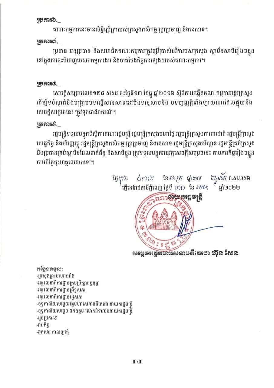 រាជធានីភ្នំពេញ៖ យោងតាមការចុះផ្សាយរបស់ BTV Cambodia នៅថ្ងៃទី២២ ខែមេសា ឆ្នាំ២០២២ បានឲ្យដឹងថា សម្តេចតេជោ ហ៊ុន សែន នាយករដ្ឋមន្ត្រី បានចេញសេចក្តីសម្រេចបង្កើតគណៈកម្មការអន្តរក្រសួងដើម្បីទប់ស្កាត់ និងបង្ក្រាបបទល្មើសនេសាទ នៅបឹងទន្លេសាប ដែលមានឯកឧត្តម វ៉េង សាខុន រដ្ឋមន្ត្រីក្រសួងកសិកម្ម រុក្ខាប្រមាញ់ និងនេសាទ ជាប្រធាន។