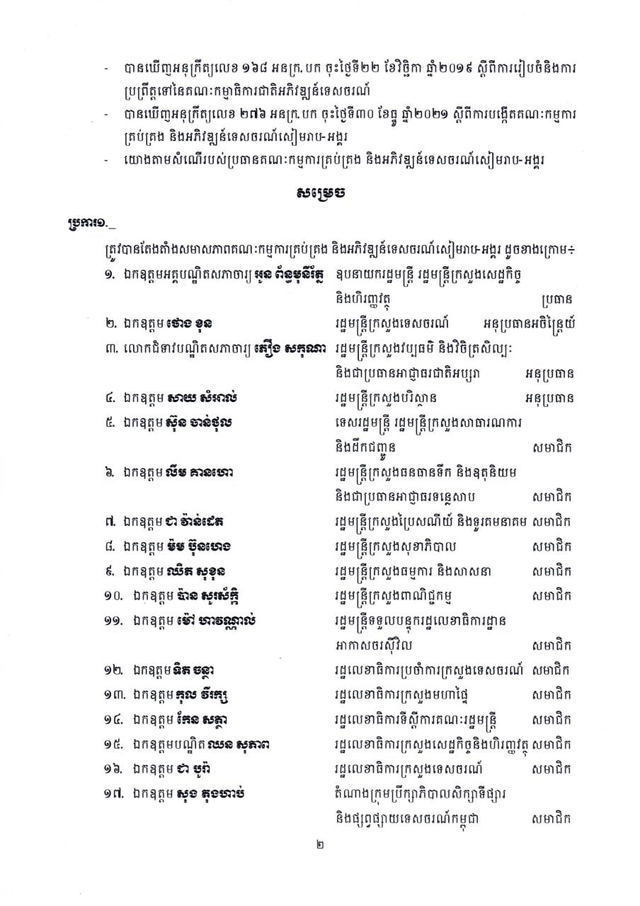 យោងតាមសេចក្ដីសម្រេចថ្ងៃទី២៣ ខែមេសា ឆ្នាំ២០២២នេះ បានតែងតាំងលោក អូន ព័ន្ធមុនីរ័ត្ន ឧបនាយករដ្ឋមន្ត្រី រដ្ឋមន្ត្រីក្រសួងសេដ្ឋកិច្ច និងហិរញ្ញវត្ថុ ជាប្រធានគណៈកម្មការគ្រប់គ្រង និងអភិវឌ្ឍន៍ទេសចរណ៍សៀមរាប-អង្គរ លោក ថោង ខុន រដ្ឋមន្ត្រីក្រសួងទេសចរណ៍ ជាអនុប្រធានអចិន្ត្រៃយ៍ និងមានសមាជិកជាច្រើនរូបទៀត។
