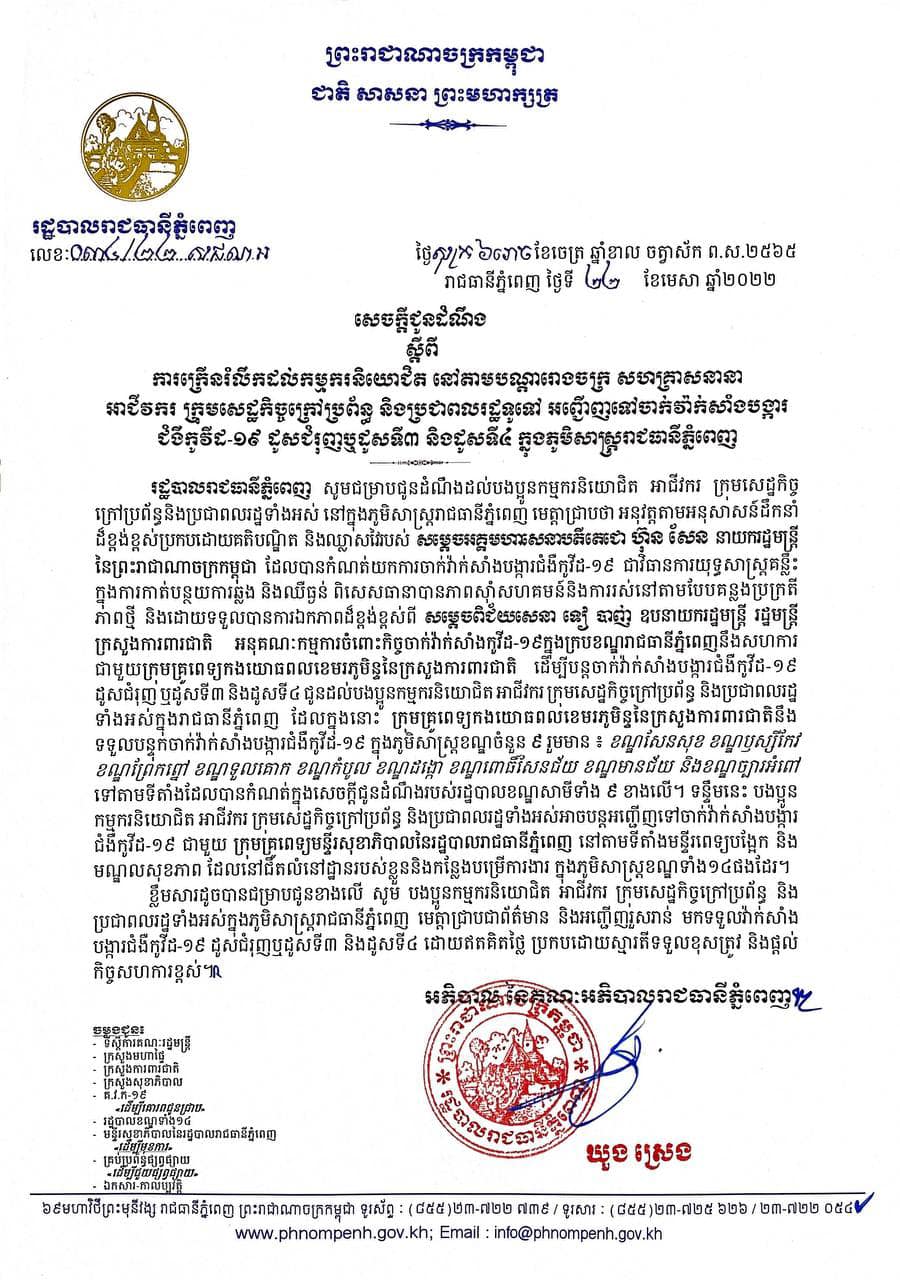 រាជធានីភ្នំពេញ៖ យោងតាមការចុះផ្សាយរបស់ រដ្ឋបាលរាជធានីភ្នំពេញ នៅថ្ងៃទី២៥ ខែមេសា ឆ្នាំ២០២២ បានចេញសេចក្ដីជូនដំណឹង ស្ដីពីការក្រើនរំលឹកដល់កម្មករនិយោជិត នៅតាមបណ្ដារោងចក្រ សហគ្រាសនានា អាជីវករ ក្រុមសេដ្ឋកិច្ចក្រៅប្រព័ន្ធ និងប្រជាពលរដ្ឋទូទៅ អញ្ជើញទៅចាក់វ៉ាក់សាំងបង្ការជំងឺកូវីដ-១៩ ដូសជំរុញ ឬដូសទី៣ និងដូសទី៤ ក្នុងភូមិសាស្រ្តរាជធានីភ្នំពេញ។
