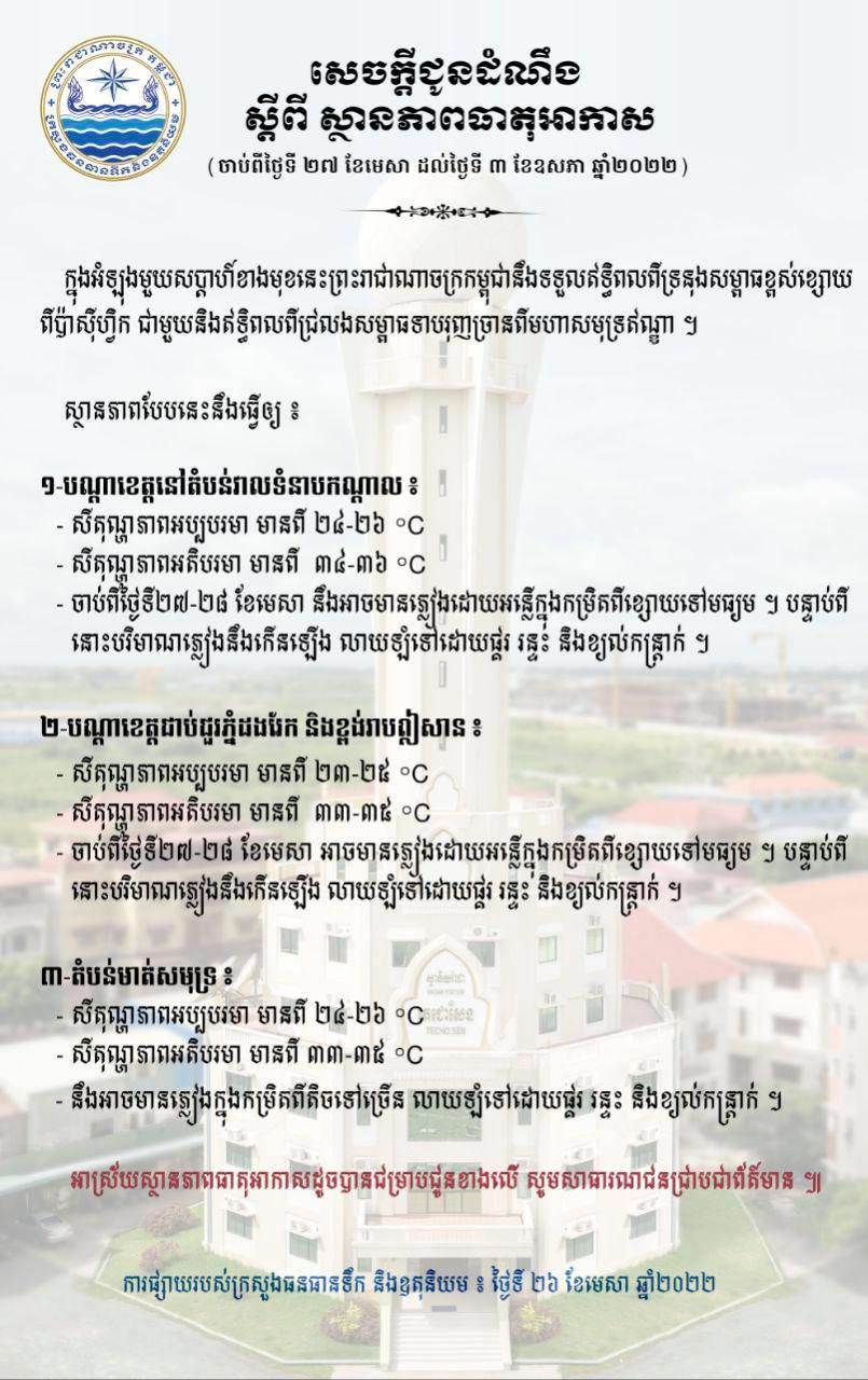 រាជធានីភ្នំពេញ៖ យោងតាមការចុះផ្សាយរបស់ ក្រសួងធនធានទឹក និងឧតុនិយម នៅថ្ងៃទី២៦ ខែមេសា ឆ្នាំ២០២២ បានចេញសេចក្ដីជូនដំណឹងស្ដីពី ស្ថានភាពធាតុអាកាសចាប់ពីថ្ងៃទី២៧ ខែមេសា ដល់ថ្ងៃទី០៣ ខែឧសភា ឆ្នាំ២០២២ បានឲ្យជ្រាបថា៖