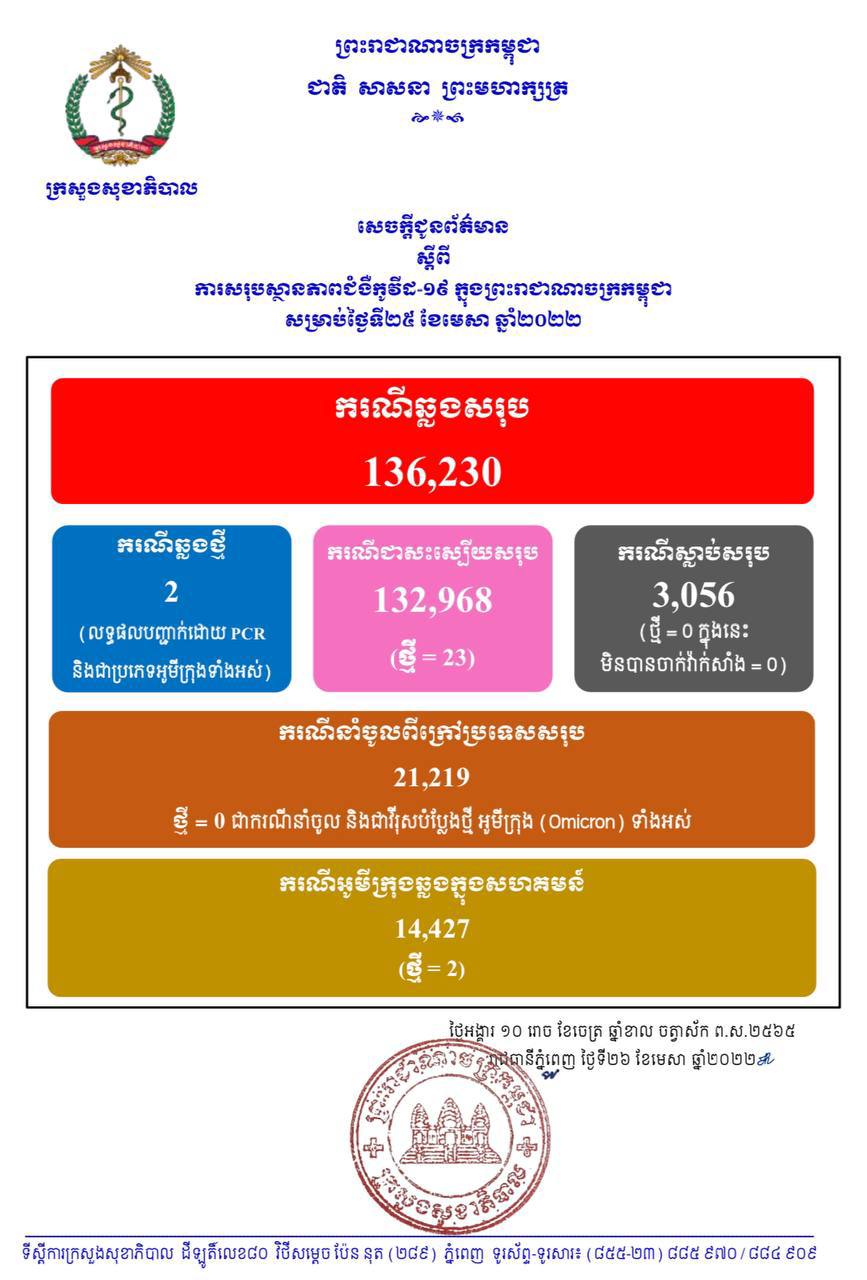 នៅថ្ងៃទី26 ខែមេសា ឆ្នាំ2022នេះ ក្រសួងសុខាភិបាលកម្ពុជា បានចេញសេចក្តីជូនដំណឹងពី ការរកឃើញករណីវិជ្ជមានវីរុសកូវីដ១៩ថ្មី ចំនួន 02នាក់ (លទ្ធផលបញ្ជាក់ដោយ PCR នឹងជាប្រភេទអូមីក្រុងទាំងអស់) ក្នុងនោះករណីឆ្លងសហគមន៍ទាំងអស់ និងមិនមានករណីនាំចូលទេ ខណៈអ្នកបានជាសះស្បើយថ្មីមានចំនួន 23នាក់ និងមិនមានអ្នកបាត់បង់ជីវិតទេ ហើយគិតមកទល់ពេលនេះ ករណីឆ្លងកូវីដ១៩ សរុបនៅក្នុងប្រទេសកម្ពុជា មានចំនួន 136,230 នាក់, ករណីជាសះស្បើយសរុប 132,968 នាក់ និងស្លាប់សរុប 3,056 នាក់៕