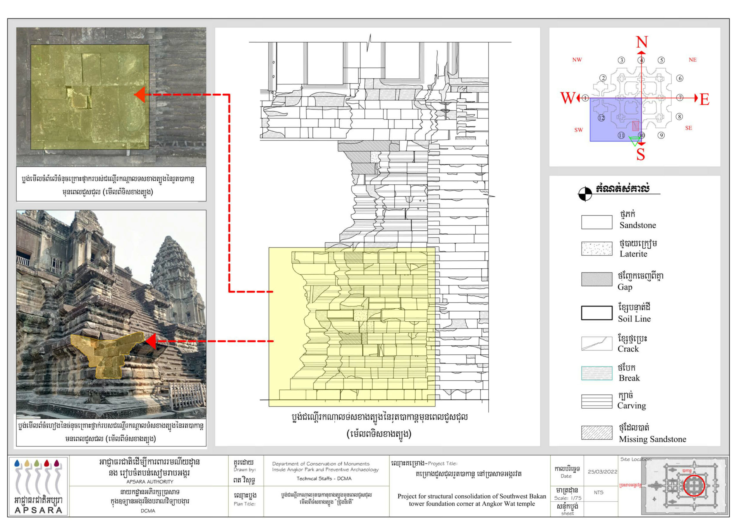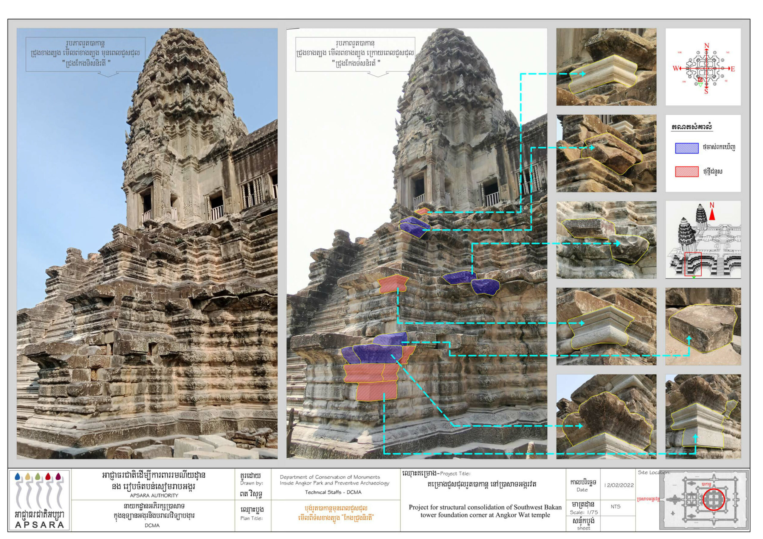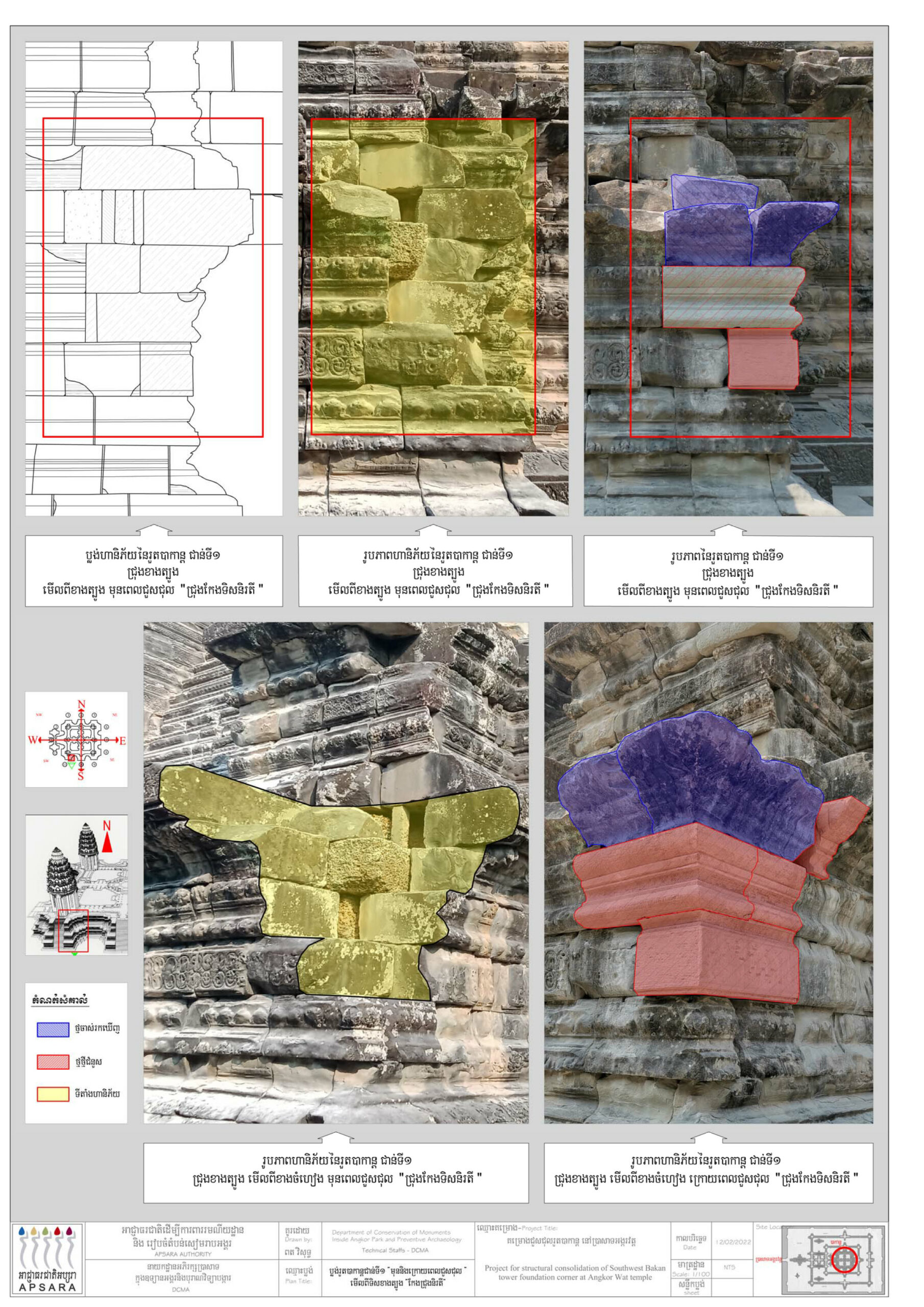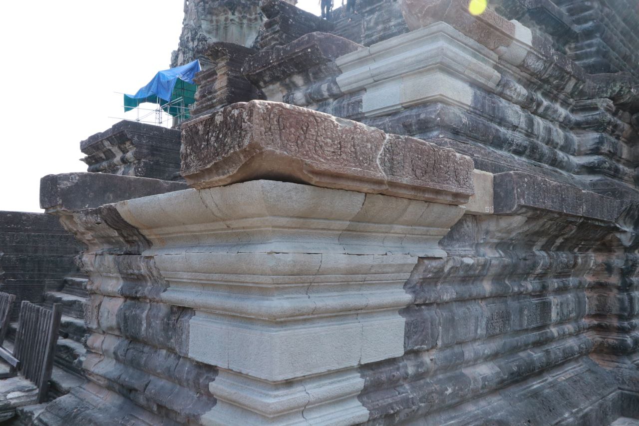 ក្រុមអ្នកជំនាញផ្នែកជួសជុល ឱ្យដឹងថា តួប្រាង្គបាកាណនៃប្រាសាទអង្គរវត្តនៅជ្រុងនិរតី និងពាយ័ព្យមានសភាពទ្រុឌទ្រោមខ្លាំងដោយសារកត្តាជាច្រើន ដូចជា អាយុកាលនៃសំណង់ចាស់ធ្វើឱ្យថ្មពុក ប្រេះ និងបាក់ ការបោះបង់ចោលដោយគ្មានការថែរក្សារយៈពេលយូរ ការបំផ្លាញដោយធម្មជាតិ មានរុក្ខជាតិ ដុះចាក់ឬស និងទឹកភ្លៀងហូរច្រោះគ្រឹះថ្មបាយក្រៀម។ កន្លងមកអាជ្ញាធរជាតិអប្សរាបានធ្វើការទល់ទ្រជាបន្តបន្ទាប់ផងដែរ តែលើកនេះគឺក្រុមការងារបានរើ កាយយកកំណកដី កម្ទេចថ្ម ចេញរួចដាក់ថ្មចូលទីតាំងដើមវិញរុញឱ្យបានកិបល្អ លែងសូវមានឃើញចន្លោះប្រហោងទៀតហើយ។ លោកបានបន្តទៀតថា ក្រុមការងារពិតជាសប្បាយចិត្តដោយសារ យើងអាចបំលាស់ទីថ្មខ្លះដែលមានទម្ងន់ប្រហែលជាង៣តោន និងបានដឹកជញ្ជូនថ្មថ្មីយកទៅប្រើប្រាស់ដោយសុវត្ថិភាព។