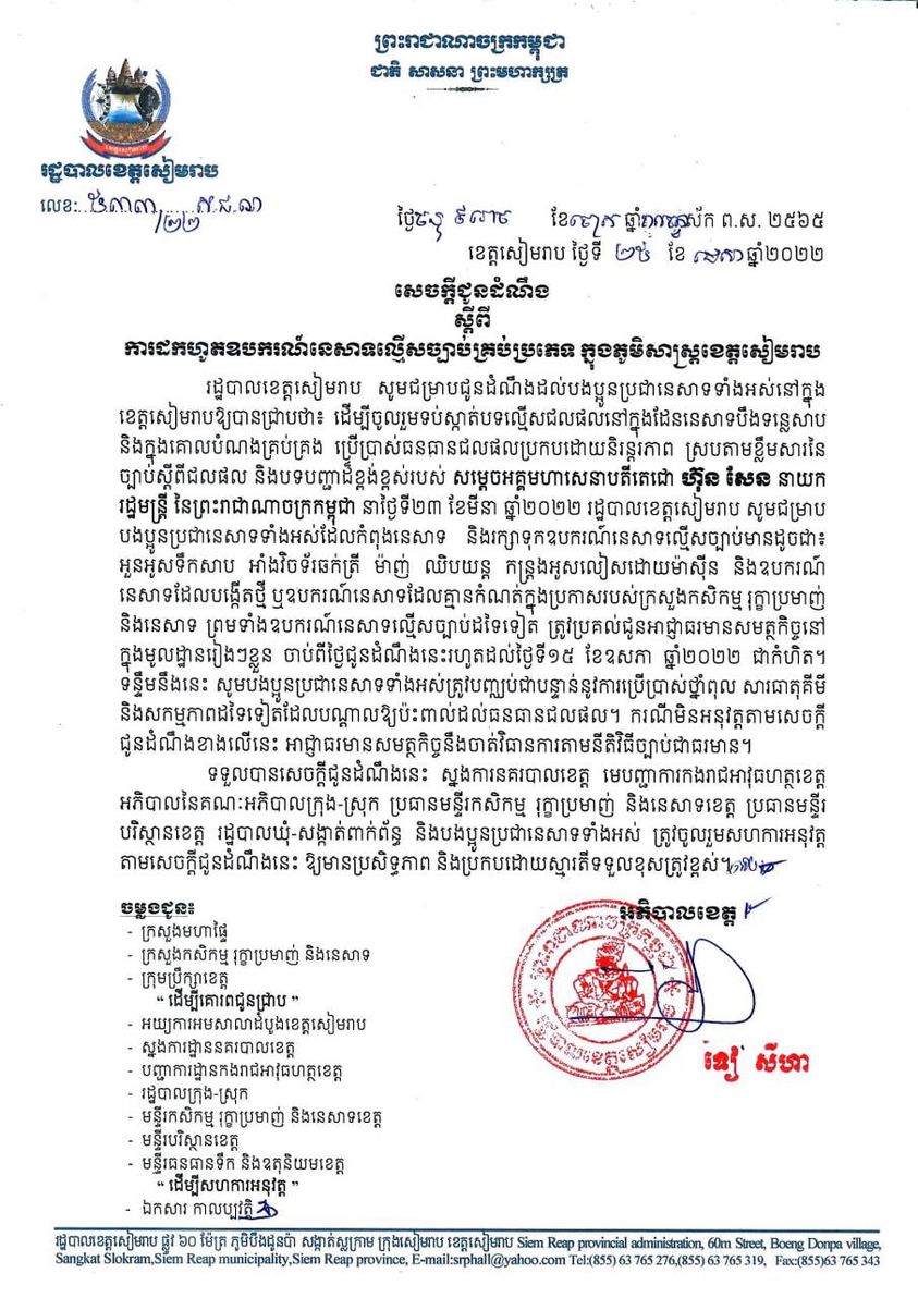 រដ្ឋបាលខេត្តសៀមរាប សូមជម្រាបជូនដំណឹងដល់បងប្អូនប្រជានេសាទទាំងអស់នៅក្នុងខេត្តសៀមរាបឲ្យបានជ្រាបថា៖ ដើម្បីចូលរួមទប់ស្កាត់បទល្មើសជលផលនៅក្នុងដែននេសាទបឹងទន្លេសាប និងក្នុងគោលបំណងគ្រប់គ្រង ប្រើប្រាស់ធនធានជលផលប្រកបដោយនិរន្តរភាព ស្របតាមខ្លឹមសារនៃច្បាប់ស្ដីពីជលផល និងបទបញ្ជាដ៏ខ្ពង់ខ្ពស់របស់ សម្តេចតេជោ ហ៊ុន សែន នាយករដ្ឋមន្ត្រីនៃព្រះរាជាណាចក្រកម្ពុជា នាថ្ងៃទី២៣ ខែមីនា ឆ្នាំ២០២២រដ្ឋបាលខេត្តសៀមរាប សូមជម្រាបបងប្អូនប្រជានេសាទទាំងអស់ដែលកំពុងនេសាទ និងរក្សាទុកឧបករណ៍នេសាទល្មើសច្បាប់មានដូចជា៖