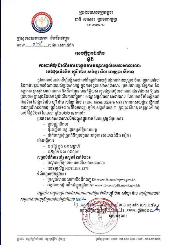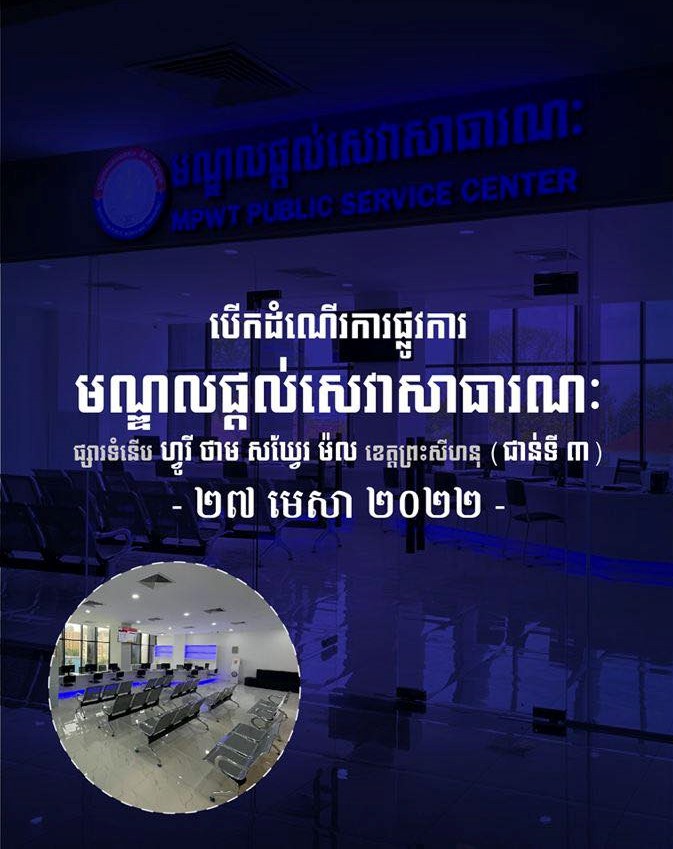 ក្នុងគោលបំណង ដើម្បីបង្ខិតសេវាទៅជិតប្រជាពលរដ្ឋ បង្កភាពងាយស្រួល ចំណញពេលវេលា និងកាត់ចំណាយរបស់ប្រជាពលរដ្ឋ ក្នុងការទទួលសេវាសាធារណៈ ប្រកបដោយប្រសិទ្ធភាព និងតម្លាភាព ក្រសួងសាធារណការ និងដឹកជញ្ជូន មានកិត្តិយស សូមជម្រាបជូនសាធារណជនទាំងអស់ ឲ្យបានជ្រាបថា ក្រសួងនឹងដាក់ឲ្យដំណើរការជាផ្លូវការ “មណ្ឌលផ្ដល់សេវាសាធារណៈ” ដែលមានទីតាំងស្ថិតនៅជាន់ទី៣ នៃផ្សារទំនើប ហ្វូរី ថាម សឃ្វែរ ម៉ល មានអាសយដ្ឋាន ស្ថិតនៅខាងត្បូងវិមានឯករាជ្យ ផ្លូវលេខ១០០ (វិថីឯករាជ្យ) ភូមិ១ សង្កាត់លេខ៣ ក្រុងព្រះសីហនុ ខេត្តព្រះសីហនុ ចាប់ពីថ្ងៃទី២៧ ខែមេសា ឆ្នាំ២០២២នេះតទៅ។