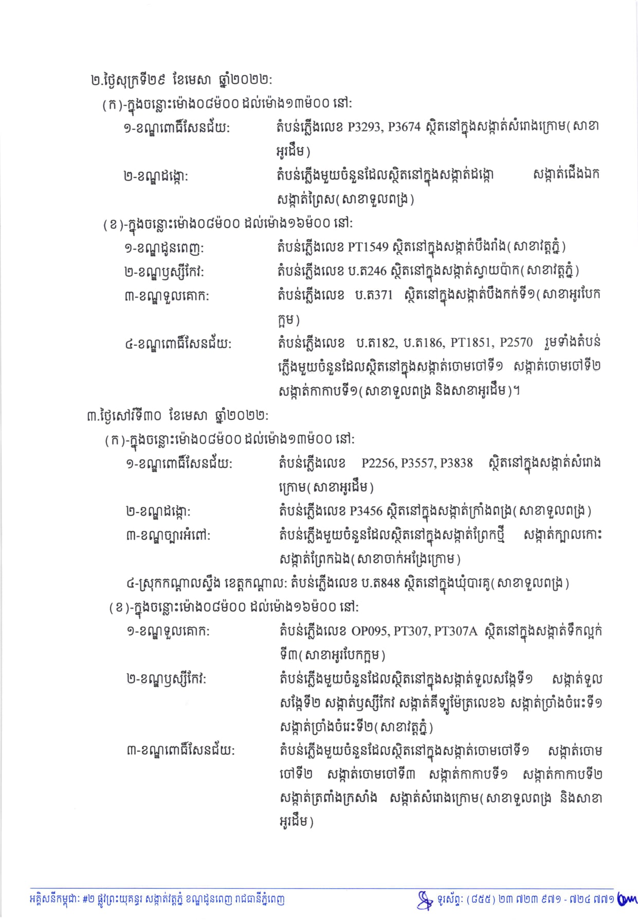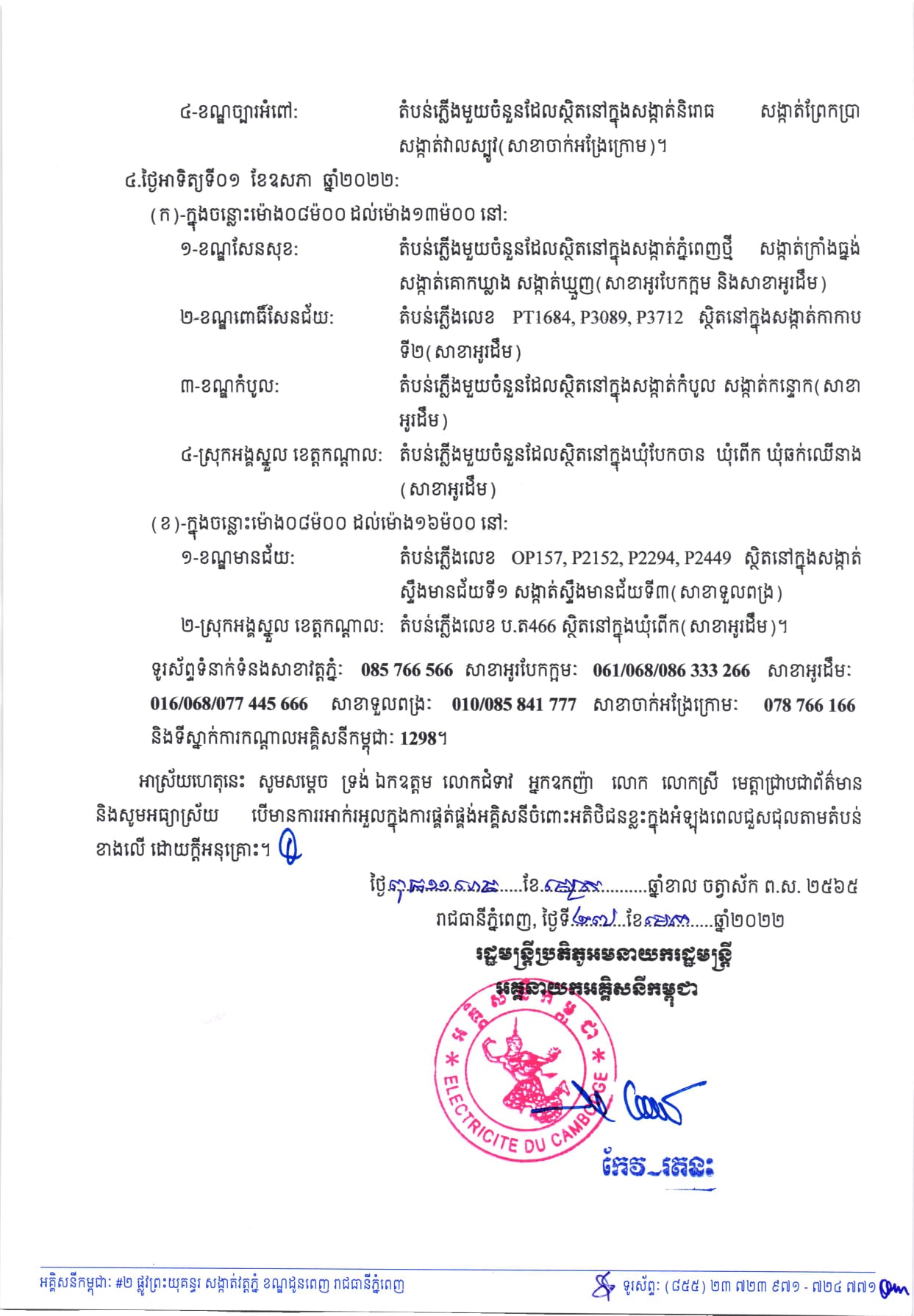 ចាប់ពីថ្ងៃនេះ ដល់ថ្ងៃទី១ ខែឧសភា អគ្គិសនីកម្ពុជា នឹងចុះអនុវត្តការងារជួសជុល ផ្លាស់ប្តូរតម្លើងបរិក្ខារ និងរុះរើគន្លងខ្សែបណ្តាញនៅតាមតំបន់ទាំងនេះ
